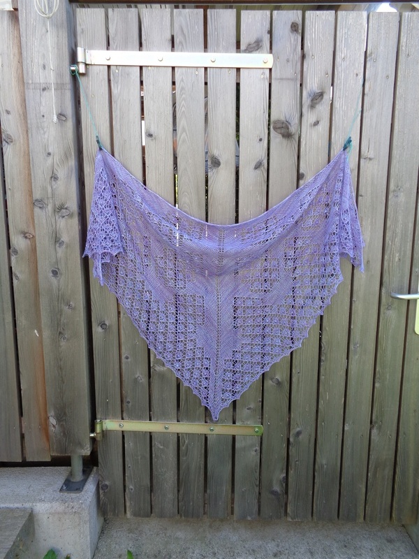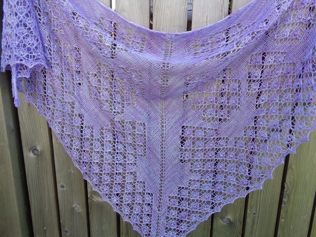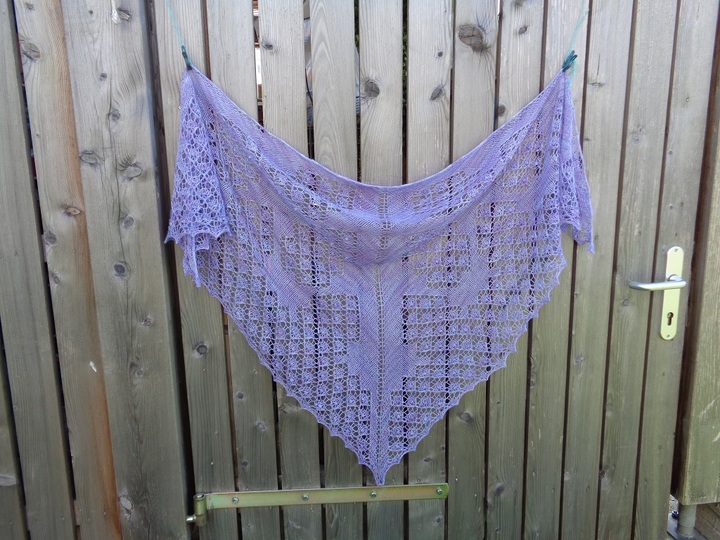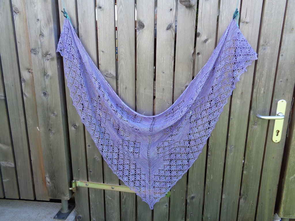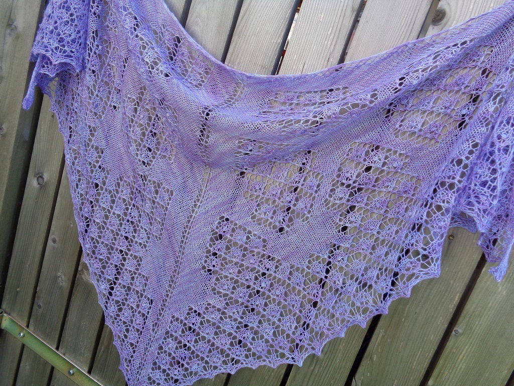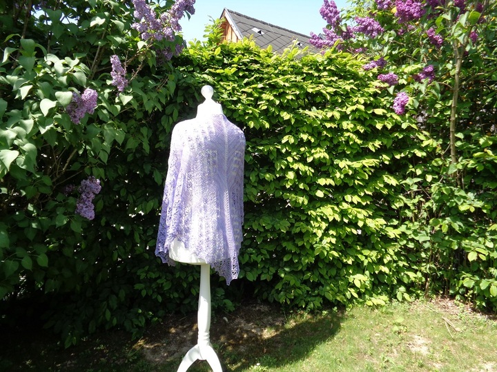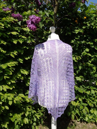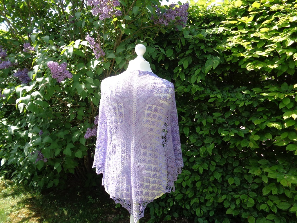 Das Stricktuch „Der Flieder blüht das ganze Jahr“ ist als Dreieckstuch angelegt, auf dem sich luftige Fliederblüten im Lochmuster mit winzigen Noppen tummeln.