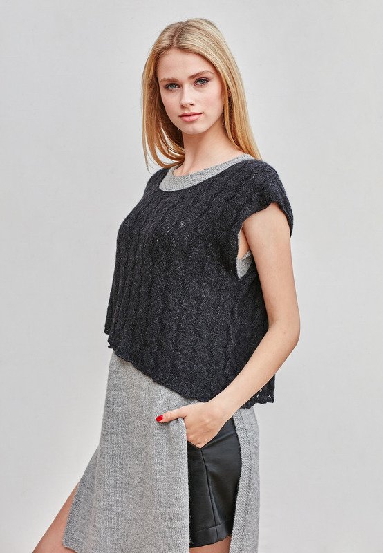 Tunika: Mirasol "Sulka Legato" (60% Schurwolle, 20% Alpaka, 20% Seide, LL ca 250 m/50 g): ca 300 (300-350-400) g Birch Black Fb 1; addi-Stricknd 3,5 mm; eine 40 cm lange addi-Rundstricknd 3,5 mm; Top: Juniper Moon "Herriot Fine" (75% Alpaka, 25% Polyamid, LL ca 420 m/100 g): ca 200 (300-300-400) g Black River Stone Fb 2006; addi-Stricknd 3,5 mm; Häkelnd 2,5 mm.