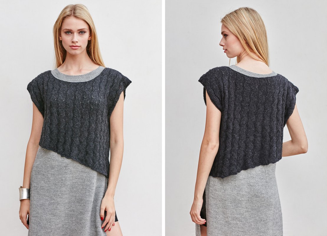 Lässiger Layering-Look! Dafür kombinieren wir zum feinen, glatt rechts gestrickten Longpulli - mit extrem hohen Seitenschlitzen - diesen asymmetrischen Pulli mit einer Zopf-Rippenstruktur.