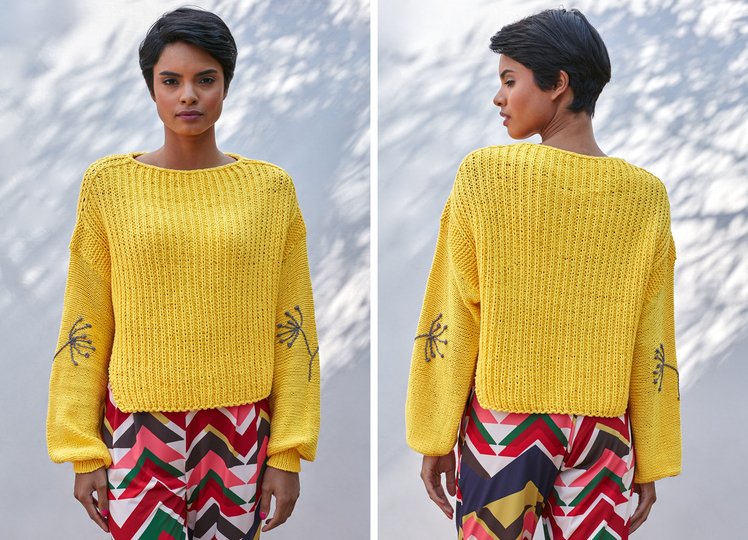 Lana Grossa "Elastico" (96% Baumwolle, 4% Polyester, LL ca 160 m/50 g): 550 g Sonnengelb Fb 107, ca 50 g Graubraun Fb 137 zum Besticken; addi-Stricknd 5,5 mm, addi-Rundstricknd 5,5 mm, 40 cm und 60 cm lang.