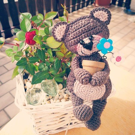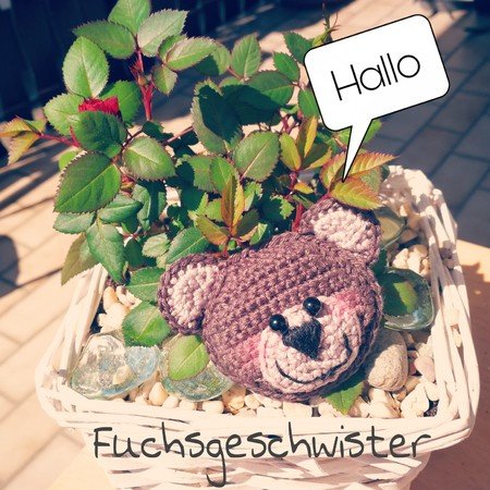 Du kannst beliebiges Garn verwenden, ich habe sie mit der Twister Ibiza (50 g 125 m) gehäkelt, du brauchs ca. 50g Hauptfarbe für den Körper und Reste in einer Kontrastfarbe für Öhrchen, Bauch und Schnauze.