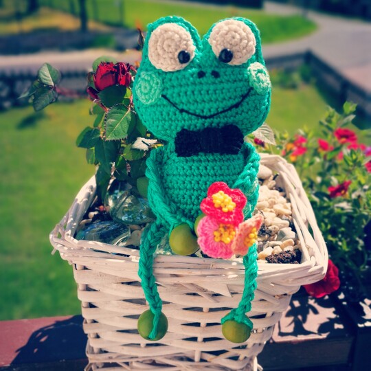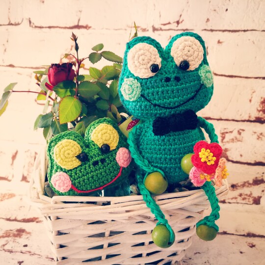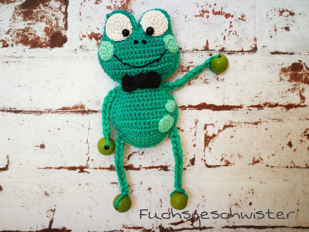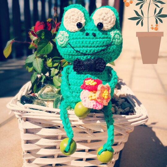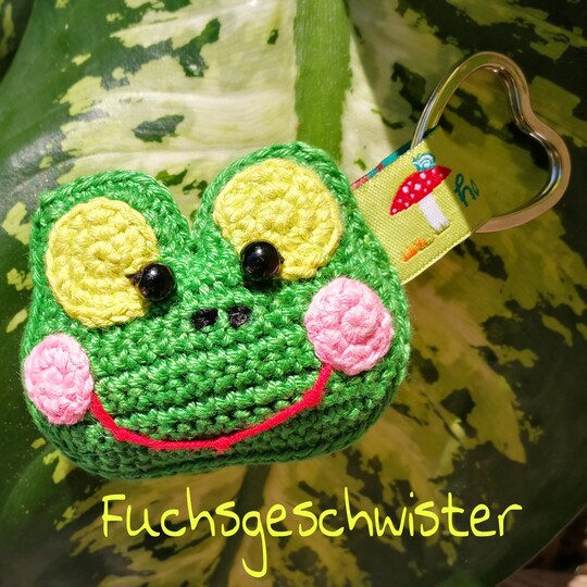 Der fertige Frosch wird mit der angegebenen Wolle ca. 15 cm groß, wenn du nur den Kopf häkelst, kann er auch als Anhänger oder Schlüsselanhänger verwendet werden.