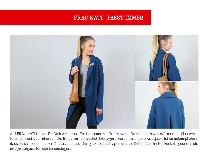 Auf FRAU KATI kannst Du Dich verlassen. Sie ist immer zur Stelle, wenn Du schnell etwas Wärmendes überwerfen möchtest oder eine schicke Begleiterin brauchst. Die legere, verschlusslose Sweatjacke ist so unkompliziert, dass sie sich jedem Look mühelos anpasst. Der große Schalkragen und die Kellerfalte im Rückenteil geben ihr die nötige Eleganz für alle Lebenslagen.