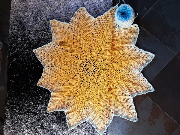 Die Decke kann als kleine Tischdecke oder als grosse Decke gearbeitet werden. Mit 150gr/560m und Nadel 4.5mm bekommt sie einen Durchmesser von 72cm.
