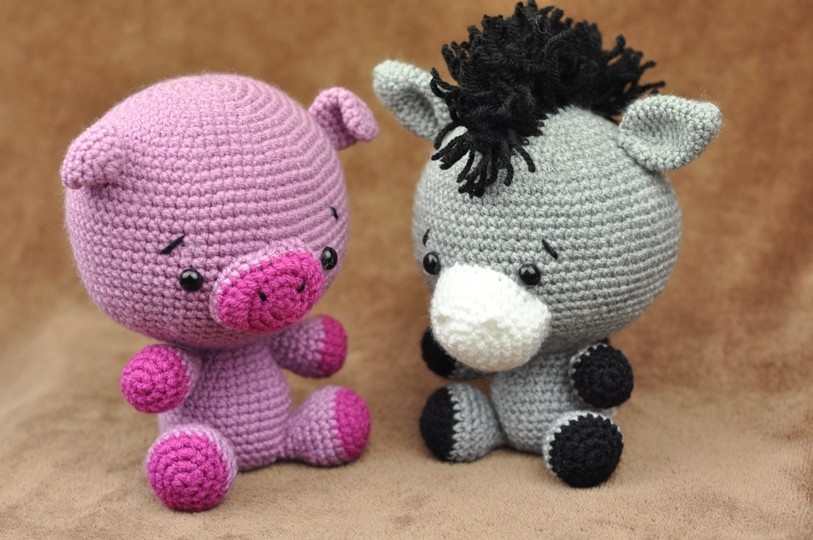 Diese beiden Häkelanleitungen sind mit je über 35 Bildern sehr detailiert beschrieben und auch für Anfänger gut geeignet. Der Esel und das Ferkel werden ca. 18 cm hoch und 14 cm breit. In der Anleitung habe ich Schachenmayr Bravo verwendet (ca. 1/2 Knäuel in grau, altrosa; Wollreste in schwarz, weiß und fresie; 50g, Lauflänge ca. 133m). Außerdem benötigt man eine Häkelnadel (3,5), Füllwatte, Sicherheitsaugen und eine Nähnadel.