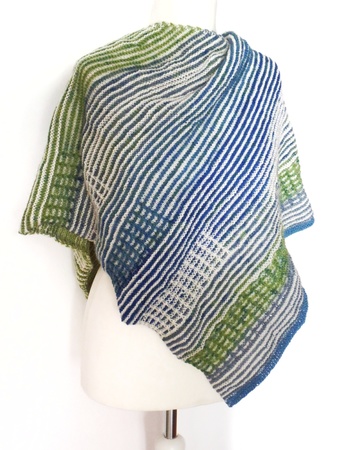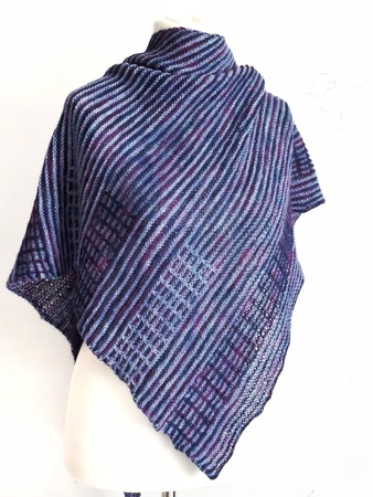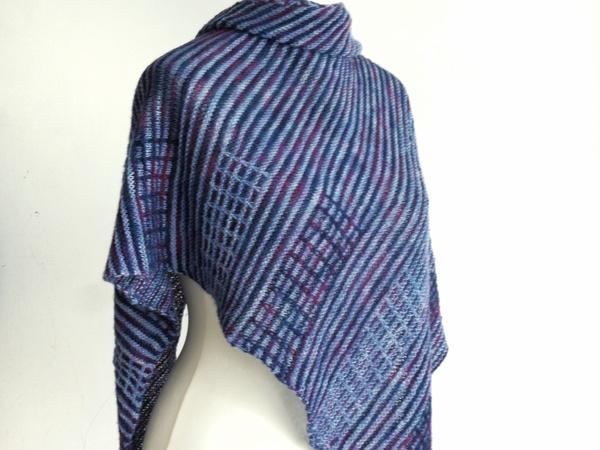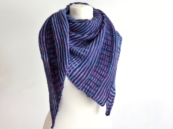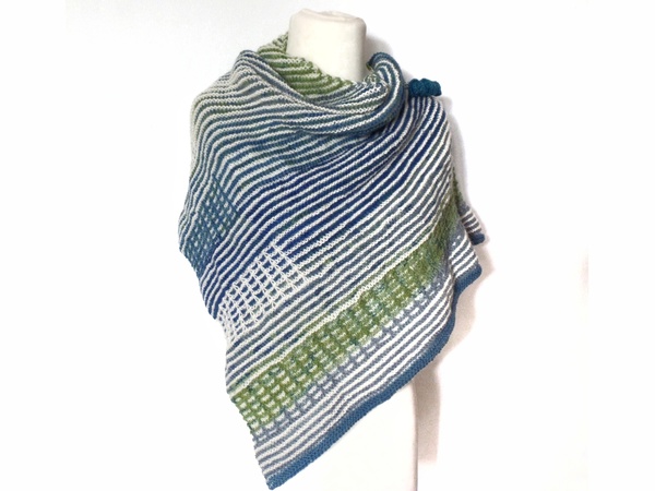 Das Tuch wird mit einseitigen Zunahmen von der seitlichen Spitze zur langen Kante gestrickt, die Hebemaschen und die Krausrippen geben das Muster. Zusätzlich wird mit einem leichten Schatteneffekt gearbeitet, aber keine Sorge: das schaffen auch Anfänger.