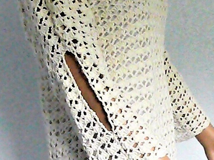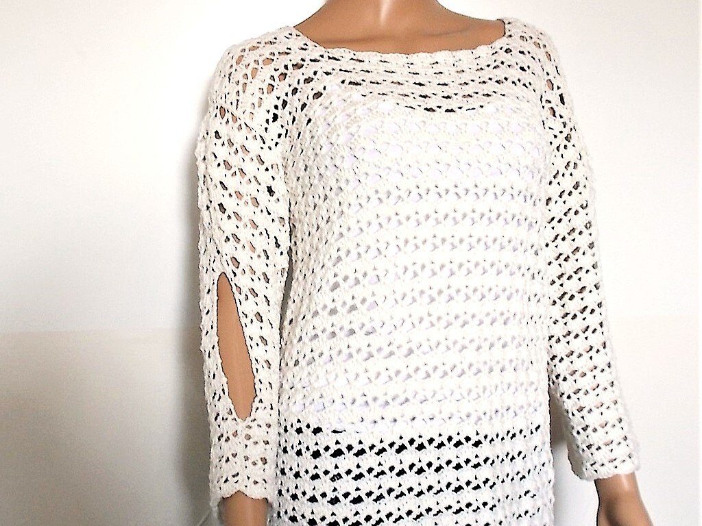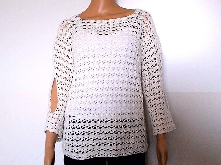 Ein schicker luftiger Häkelpulli aus Baumwolle mit offenen 3/4-Ärmeln mit raffiniertem Ärmelschlitz,