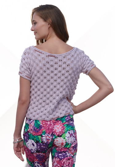 ONline "Linie 382 Malia" (50 % Baumwolle, 50 % Viskose, LL ca 110 m/50 g): ca 350 (400-450) g Helllila Fb 06; Pony-Stricknd Nr 4,0 mm, Pony-Rundstricknd Nr 4,0 mm, 40 cm lang, Pony-Nadelspiel Nr 4,0 mm; Samtband von Union Knopf, Art 1025, Fb Rosé, 9 mm breit, ca 280 (290-300) cm.