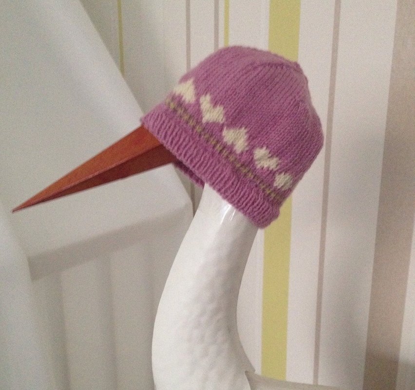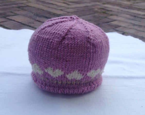 Detailierte Anleitung zum Stricken eines Babymützchens für Neugeborene (Kopfumfang 35-38cm), mit einem Herzchen-Muster.