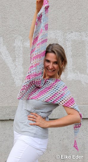 Das Tuch wird von der Seite aus gehäkelt und ist symmetrisch. Es ist schmäler als die bekannten Dreieckstücher, dadurch vielseitig einsetzbar: z. B. als Schal, Tuch, Hüfttuch, schnell gewickeltes Top, Loop etc.