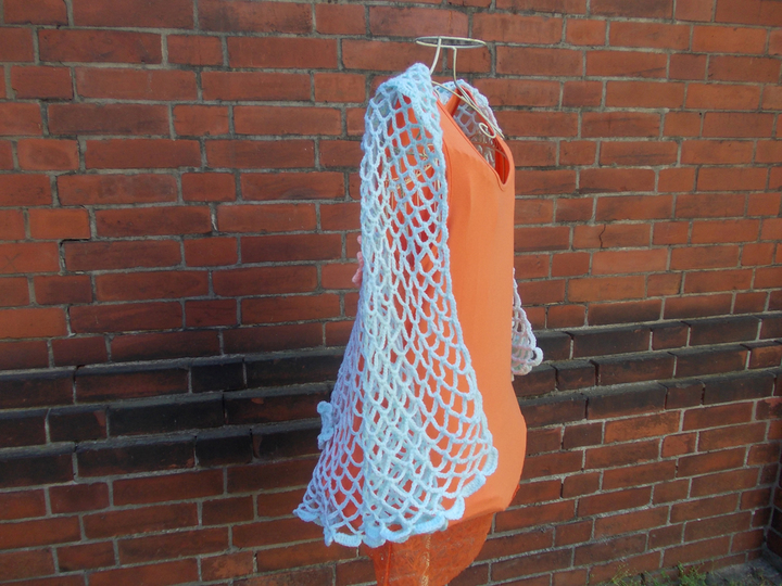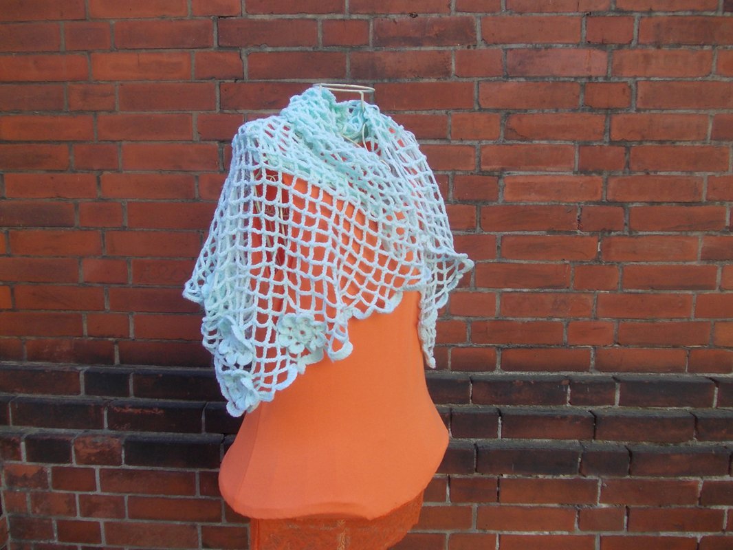 Für mein Tuch habe ich ca. 150 g Material (ohne Blumen) verwendet, und zwar 100 % Polyacryl (G-B No. 1) in mint, 150 m Lauflänge auf 50 g), geeignet für Nadelstärke 3- 3,5, allerdings habe ich mit Häkelnadel Nr. 4 gehäkelt, dies empfehle ich auch. Sollte anderes Material verwendet werden (Baumwolle oder Mischgarn), sollte dieses auf 50 g mindestens 100 m Lauflänge haben und für Nadelstärke 3 – 4 geeignet sein.