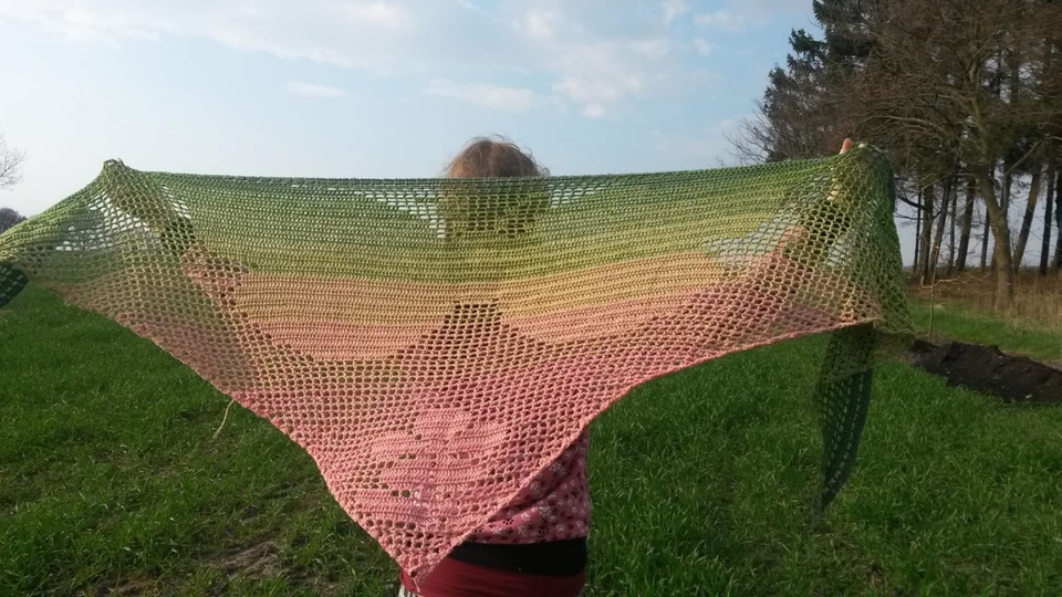 Material: Bei einem 3/4 fädigen Bobbel und einer Nadelstärke von 3/4 benötigt man ca. LL 1100m, je nachdem wie fest oder locker man häkelt. DasTuch hat dann ca. die Maße von 230x95 cm.