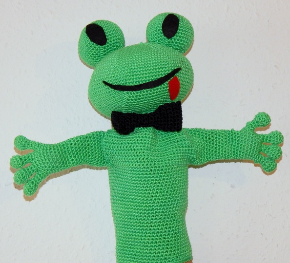 Dies ist eine Häkelanleitung für eine Handpuppe in der Form eines Frosches.