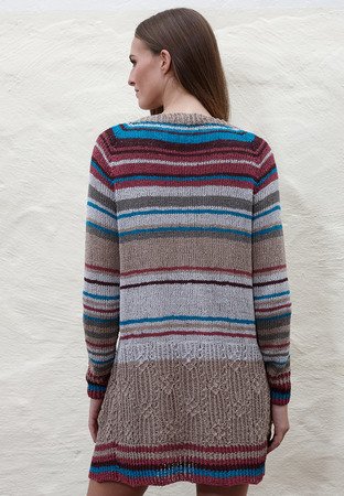 Was wären die ersten Frühlingstage ohne geliebten Longcardigan? Naturtöne und bunte Kontraststreifen machen diese Jacke zu einem vielseitig stylebaren Lieblingsteil.