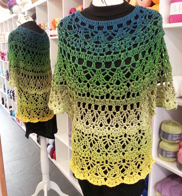 Dieses Shirt wird in Runden von oben nach unten gehäkelt. Das Muster ist bis zu den Armen mit Zunahmen und verläuft dann gerade.