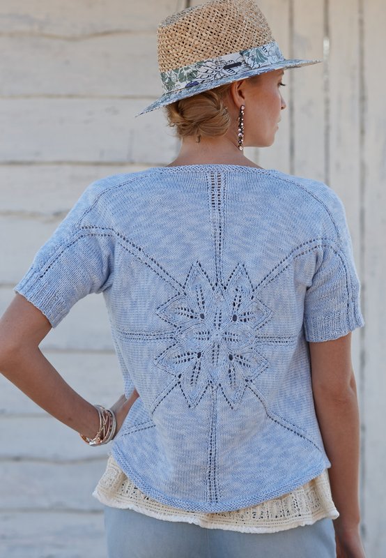 Auf den ersten Blick wirkt die verschlusslose Jacke eher schlicht, doch im Rücken überrascht sie uns mit einem kunstgestrickten Eyecatcher.