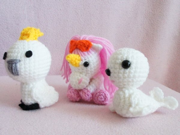 1 Häkelnadel Nadelstärke 3,0, ca. 30g weiße Wolle, ca. 25g rosa Wolle (abhängig davon wieviele Haare ihr euch ranknüpft), etwas orange und gelbe Wolle (bei allen 4 kein vollständiges Knäul nötig) - In meiner Anleitung habe ich Gründl Lisa Premium verwendet mit den Farbzahlen: 01, 10, 11, 31