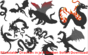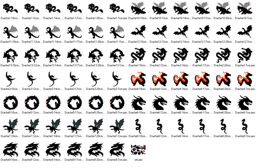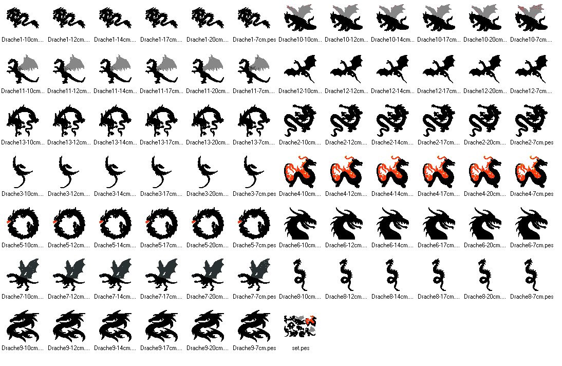 Stickdateiserie mit 13 verschiedenen Drachen in je 6 Größen