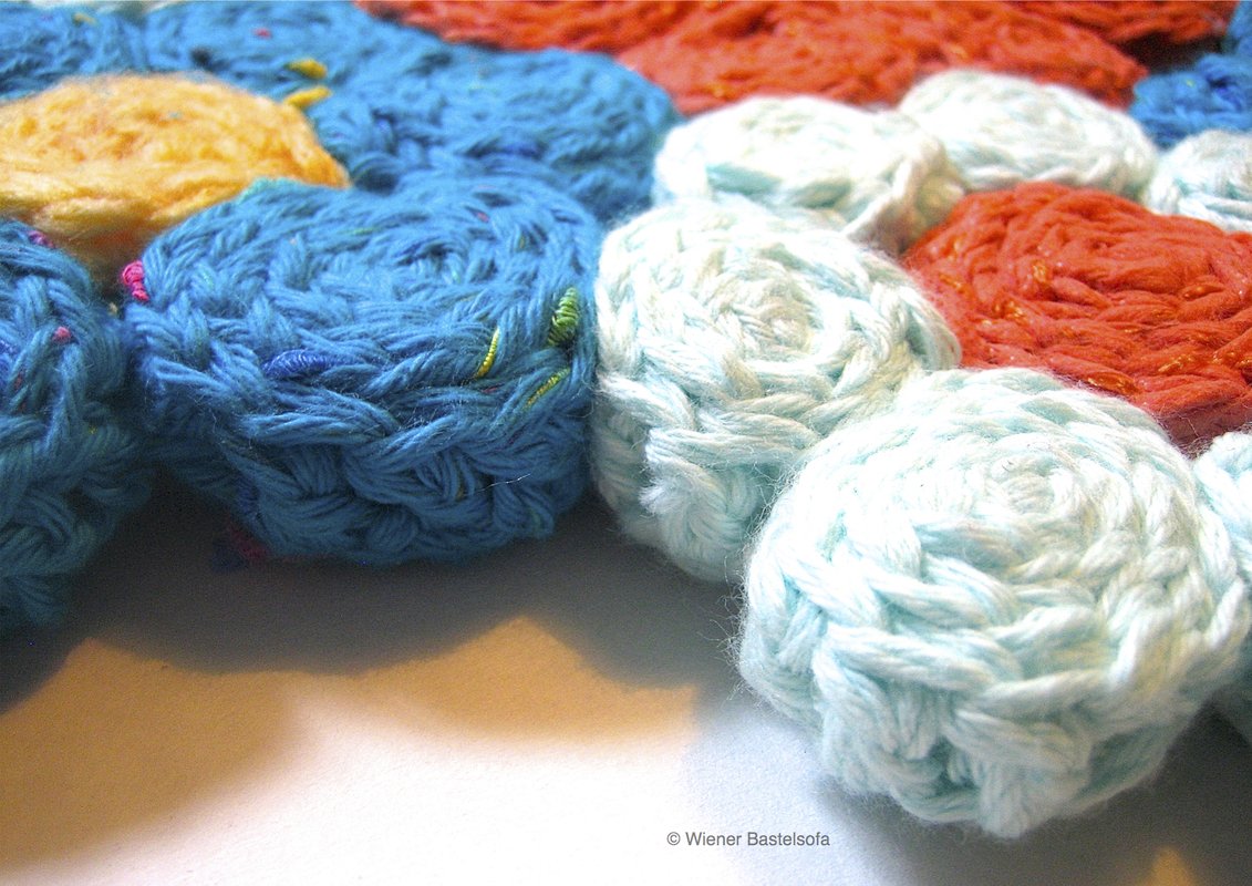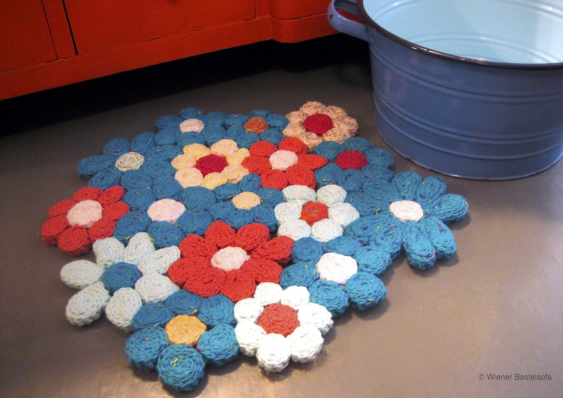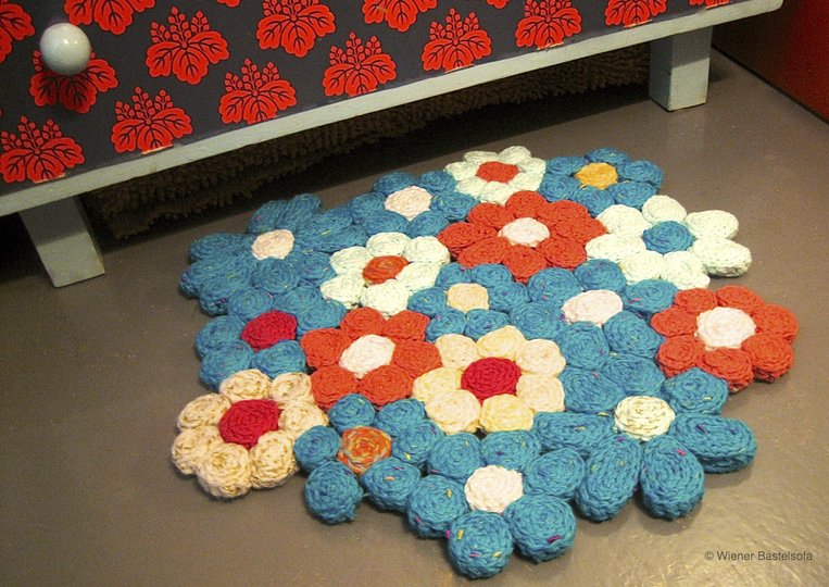 Für diesen bunten Blumenteppich benötigst du sehr viele Wollreste und Geduld. Die Mühe lohnt sich, der Teppich ist ein toller Blickfang. Ich habe Reste und Restposten unterschiedlicher Wollstärken und Wollqualitäten verwendet und die Fäden doppelt, dreifach oder vierfach mit Häkelnadel Nr. 5 sehr kompakt verarbeitet. Damit der Teppich nicht rutscht, sind Teile der Rückseite mit Pluster- oder Sockenstoppfarben beschichtet.