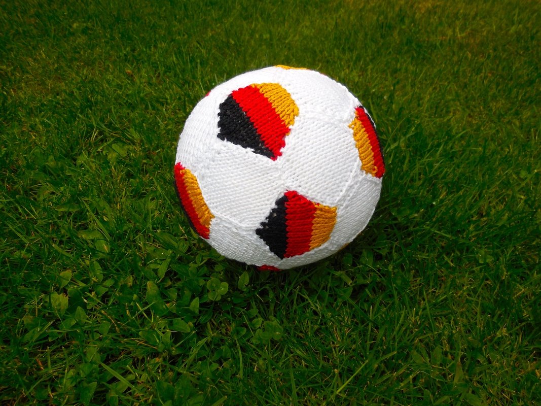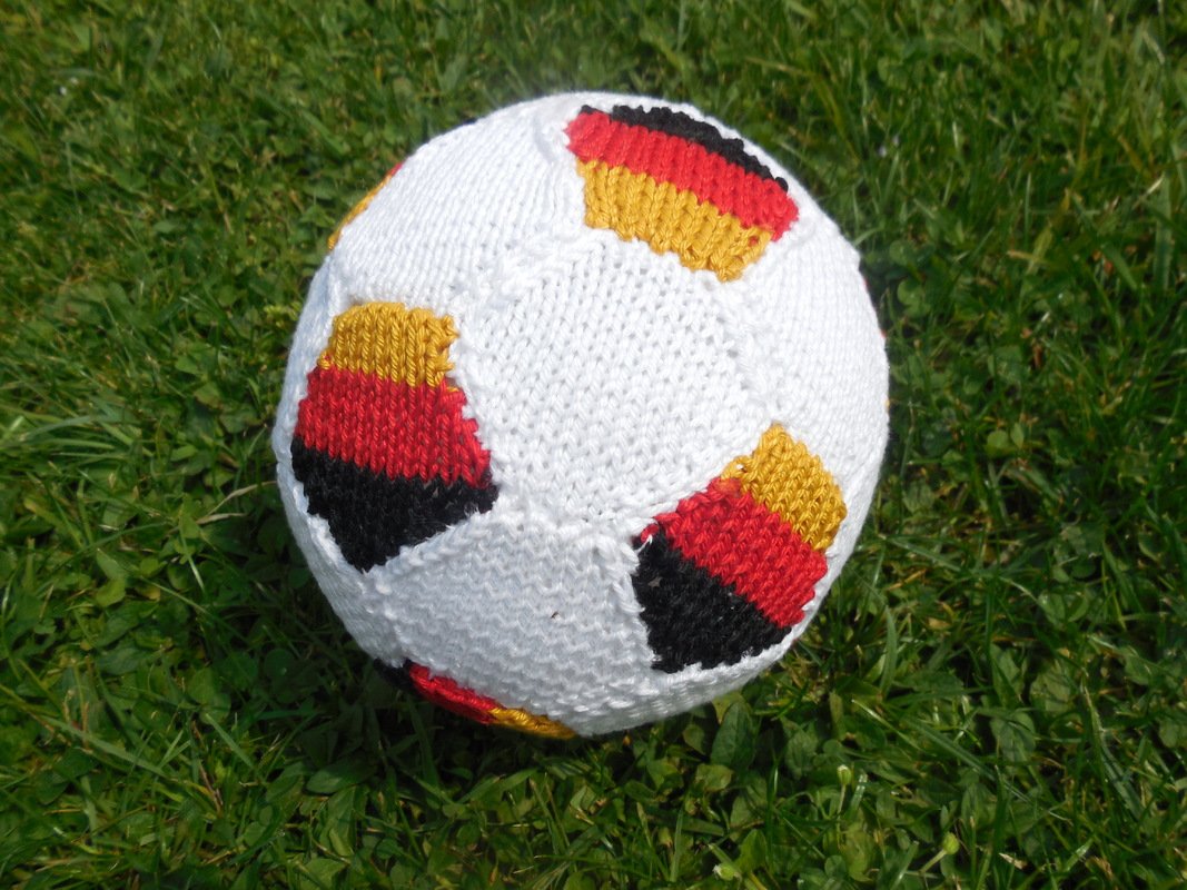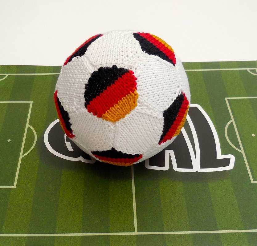 Dieser Ball erfreut jedes Fussballherz und ist relativ einfach zu stricken. Das Kniffligste daran ist lediglich das Zusammennähen. Es ist zwar nicht schwierig, dank Fotos zu den jeweiligen Arbeitsschritten, jedoch etwas zeitaufwändig. Die Deutschlandfarben kann man natürlich auch durch schwarz ersetzen.