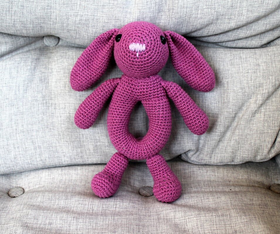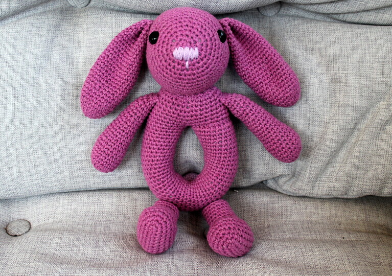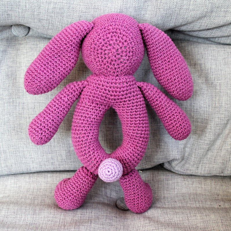Fertig gehäkelt wird das Schlappohr ca 25 cm hoch. Außerdem befindet sich in seinem Kopf noch eine Rassel.