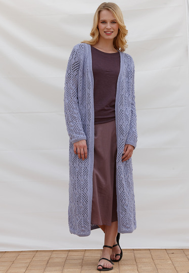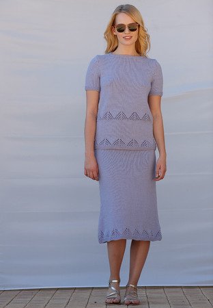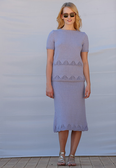 LANG YARNS "Nelly" (60% Baumwolle, 40% Polyacryl, LL ca 110 m/50 g): für alle Teile: ca 1500 (1600-1750-1900) g Flieder Fb 874.007 (für den Pulli 350 (350-400-450) g, für den Rock 400 (450-500-550) g, für den Mantel 750 (800-850-900) g); Pony-Stricknd Nr 4,5, Pony-Rundstricknd Nr 4,5, 40 und 60 cm lang, Gummiband, ca 3,5 cm breit, in Taillenweite.