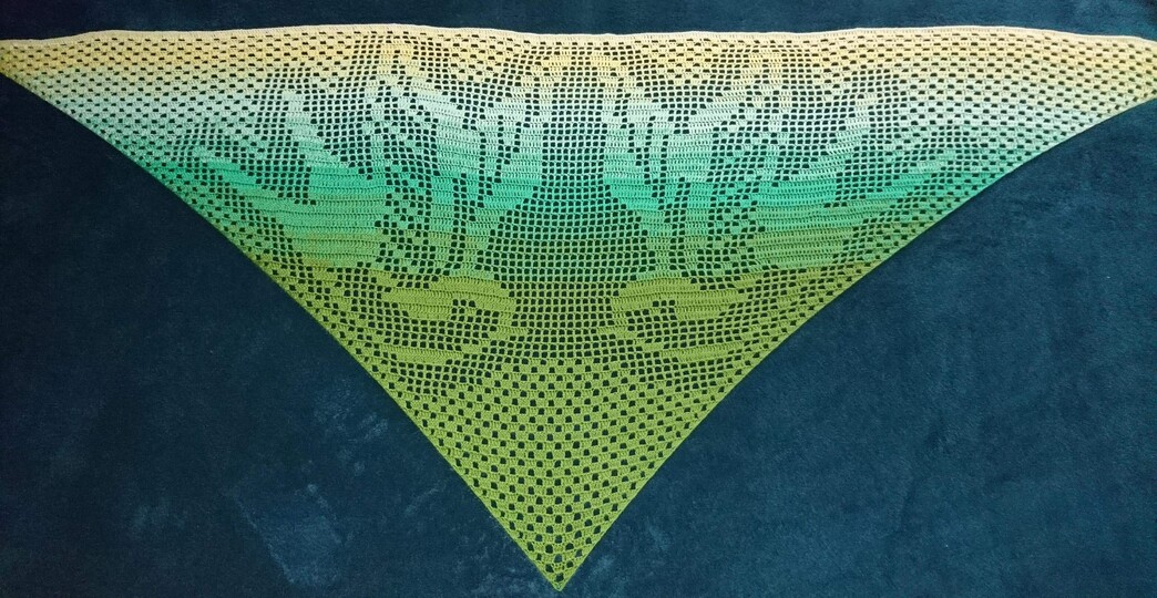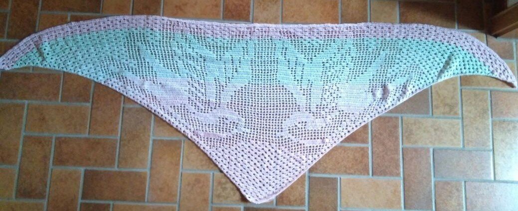 Die Anleitung ist auf 4 Seiten in teilweise Schrift (Erklärung Filethäkeln), der Anfang des Tuches in Häkelschrift und Zählraster geschrieben.