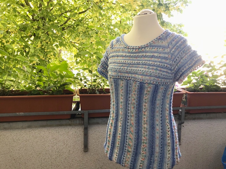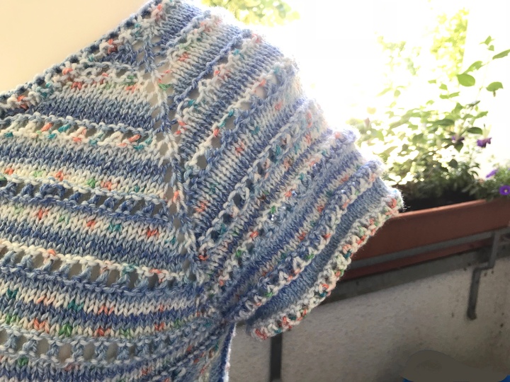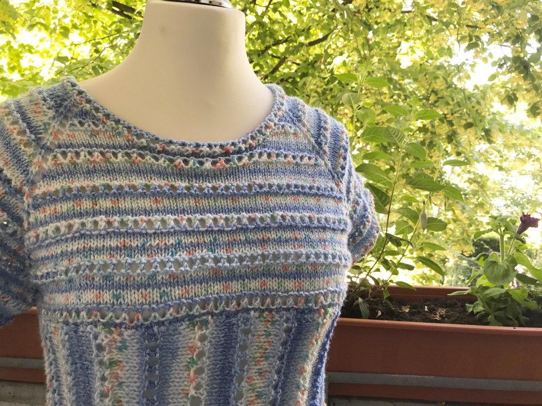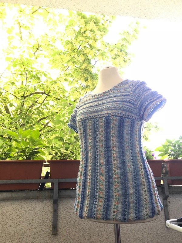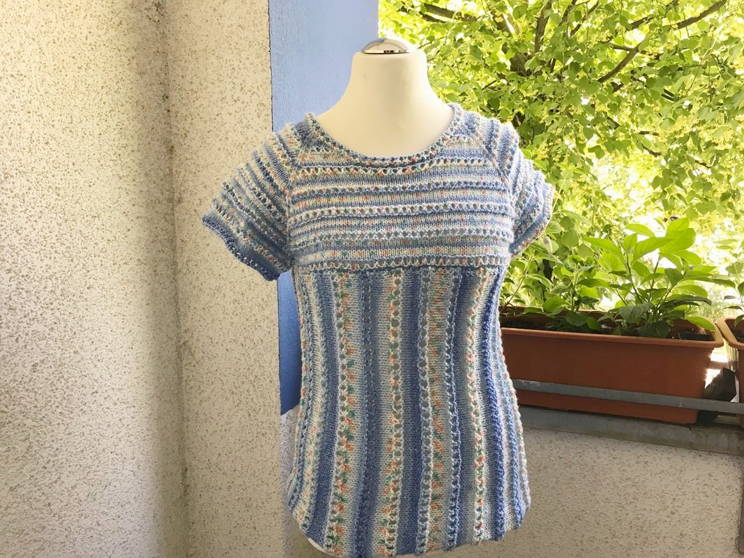 Dieses verspielte Sommershirt wird bis zur Hälfte von oben nach unten gestrickt. Danach wird quer weiter gearbeitet. Durch die unterschiedlichen Strickrichtungen und die verschiedenen Nadelgrößen ergibt sich dieses tolle Muster. Probier es gleich aus.