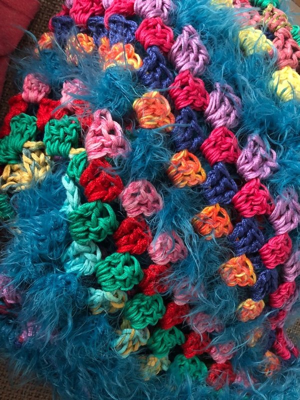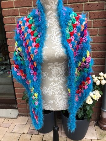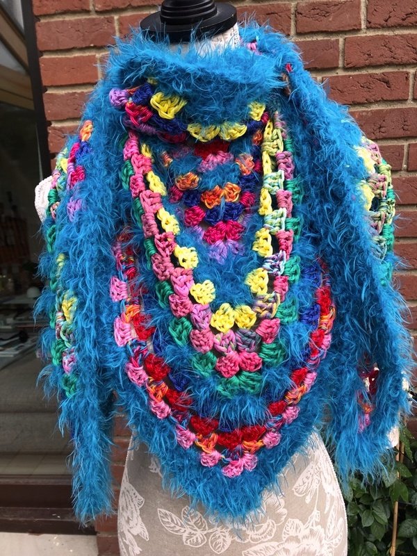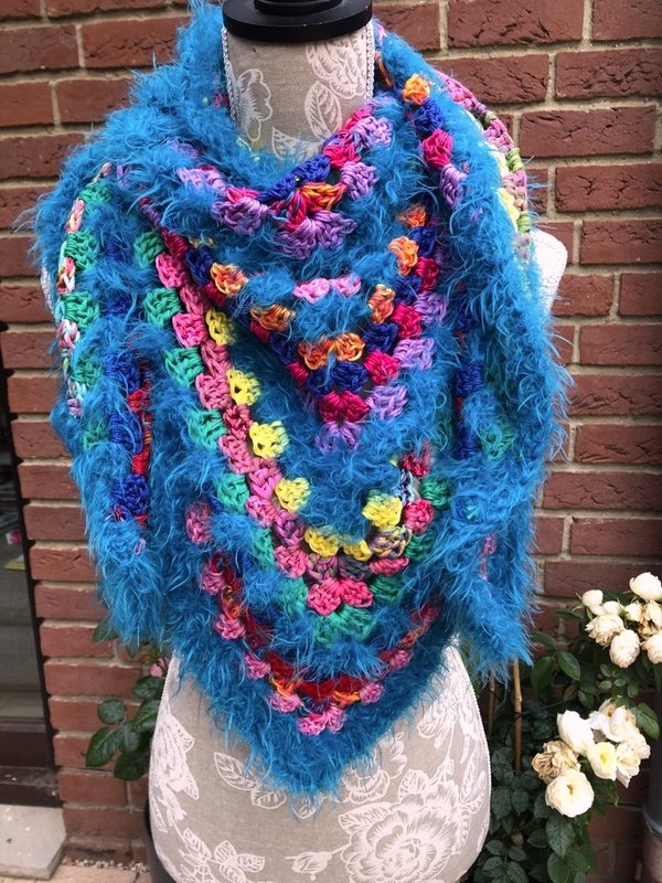 Hier kannst Du Dir ziemlich fix, da mit dicker Nadel, ein dreieckiges Tuch häkeln, das wirklich einzigartig ist, um das Dich jeder beneiden wird .... und niemand kann es nachhäkeln, da nur DU diese Wollreste hast ;)