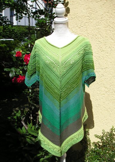 Die Tunika wird in einem Stück gestrickt beginnend vom Halsausschnitt bis zur unteren Kante. Dabei werden im oberen Teil bis zu den Ärmeln verschiedene Lochmuster eingearbeitet. Es wird ein LoLa-Bobbel Farbverlaufsgarn von der Firma Garnmanufaktur verstrickt. Material: 50 % Baumwolle, 50 % Acryl. Dabei entsteht ein locker fallendes Kleidungsstück für sommerliche Temperaturen. Die Tunikaform streckt und schummelt so ein paar Kilos weg.