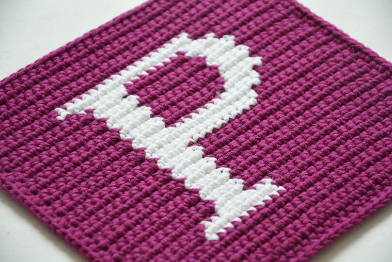 Neben der schriftlichen Anleitung für den Buchstaben-Topflappen sind ein Häkelschema in Farbe und ein Häkelschema in schwarz-weiß enthalten.
