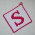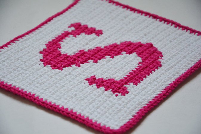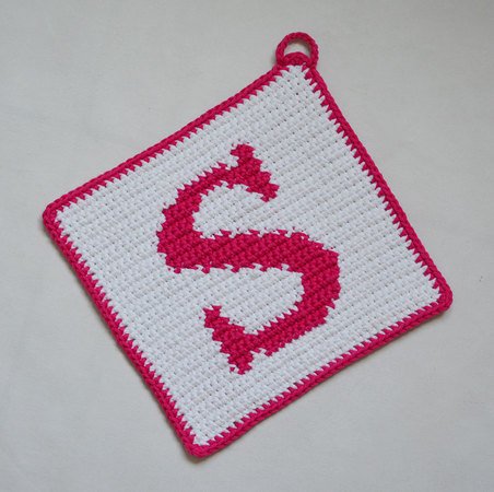 Neben der schriftlichen Anleitung für den Buchstaben-Topflappen sind ein Häkelschema in Farbe und ein Häkelschema in schwarz-weiß enthalten.