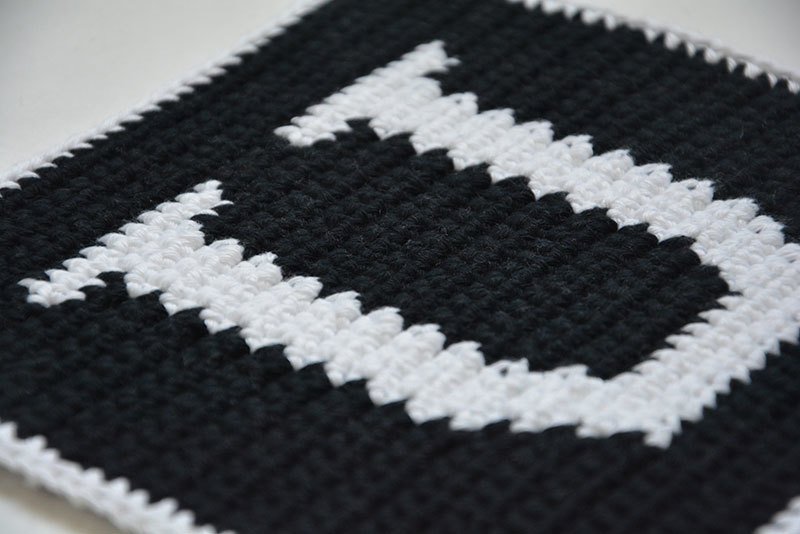 Neben der schriftlichen Anleitung für den Buchstaben-Topflappen sind ein Häkelschema in Farbe und ein Häkelschema in schwarz-weiß enthalten.