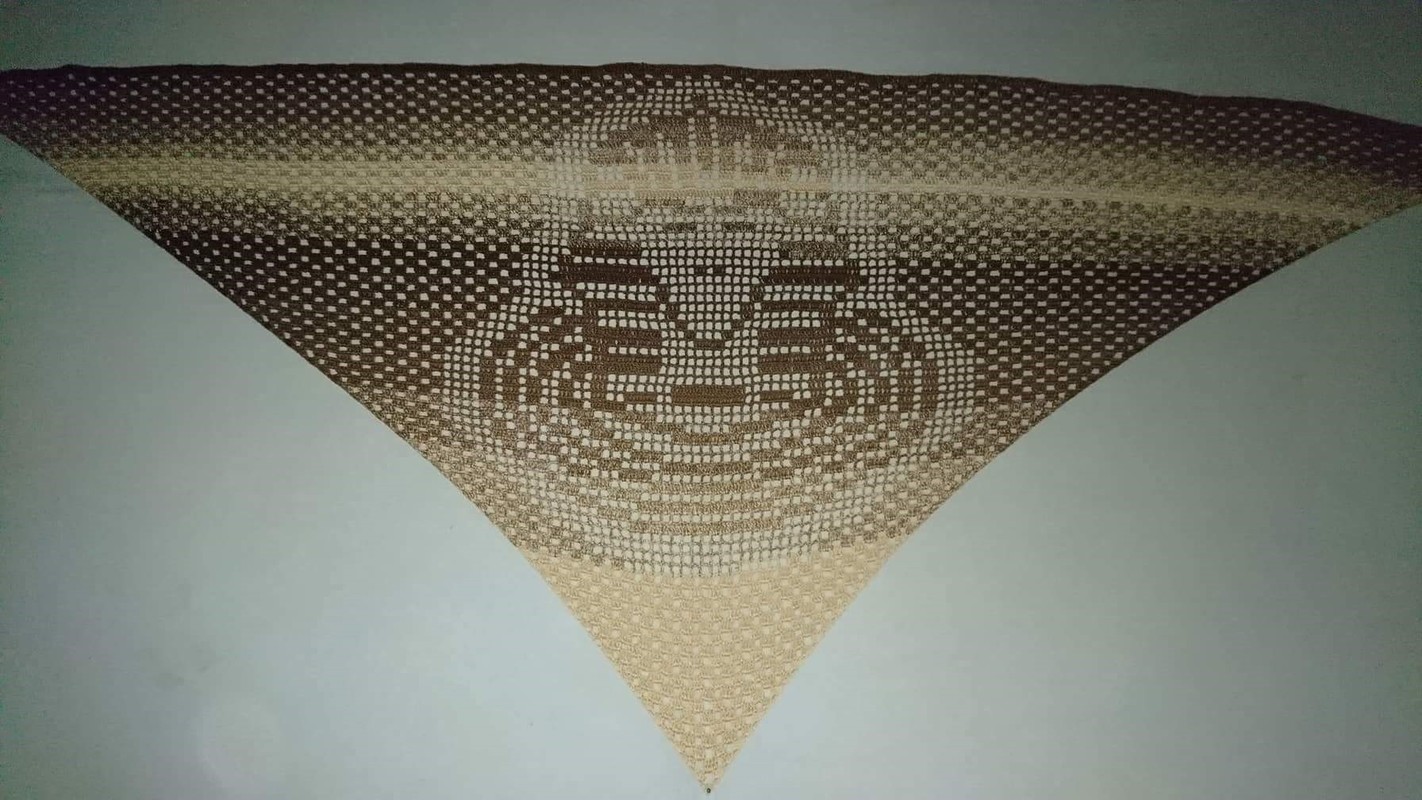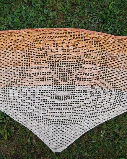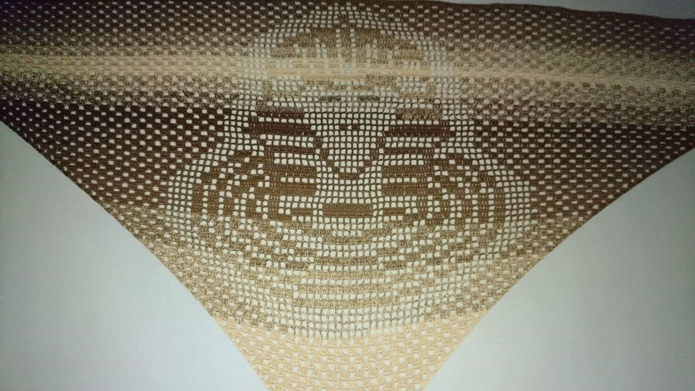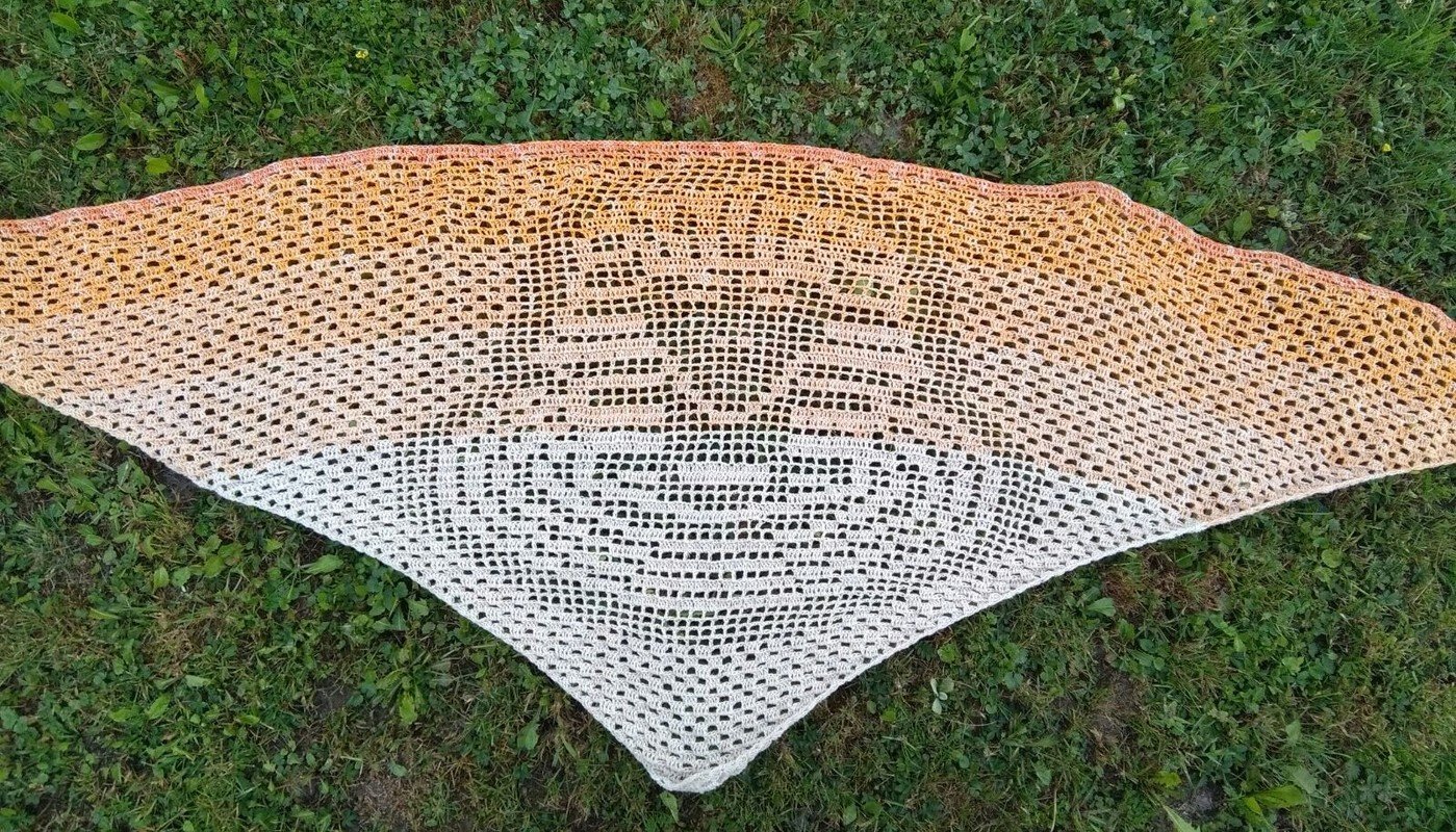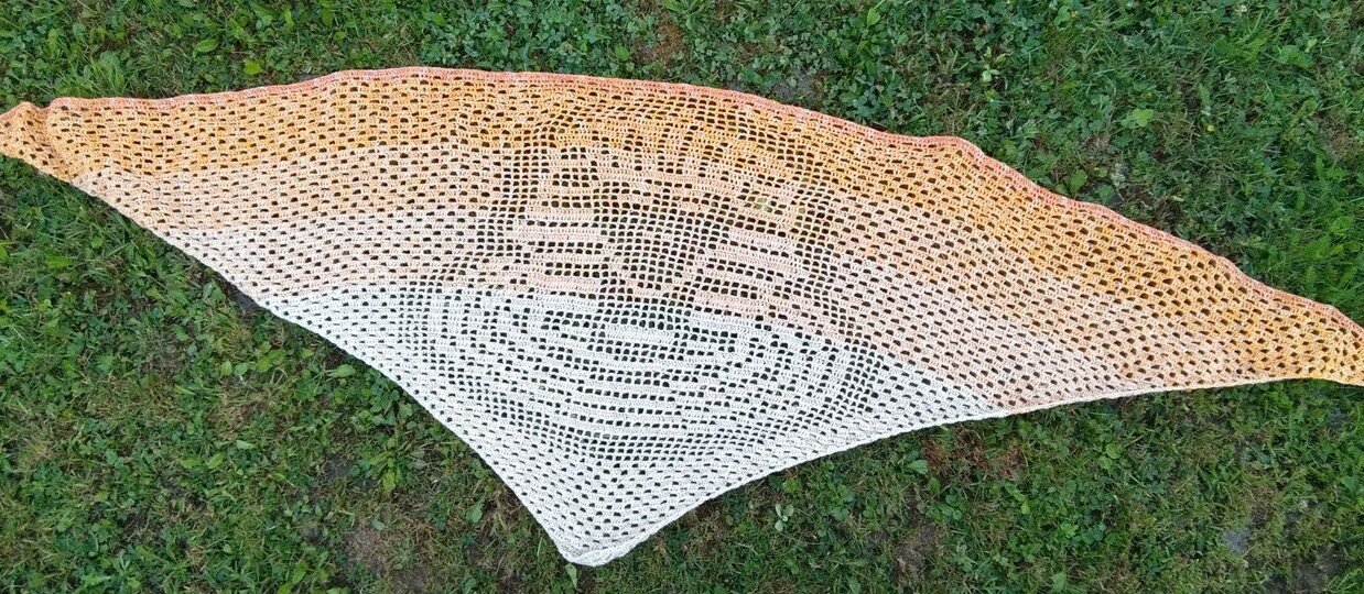 Die Anleitung ist auf 4 Seiten in teilweise Schrift (Erklärung Filethäkeln), der Anfang des Tuches in Häkelschrift und Zählraster geschrieben.