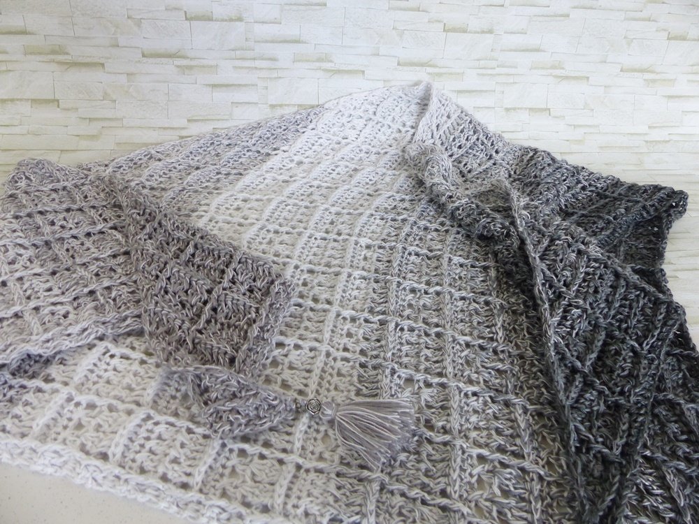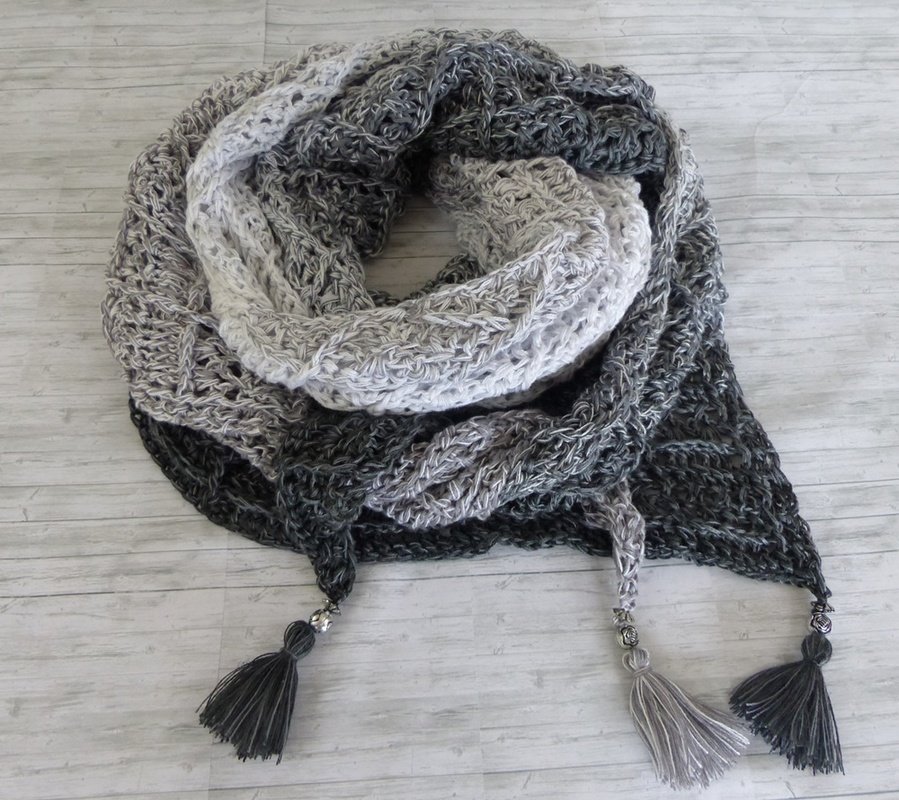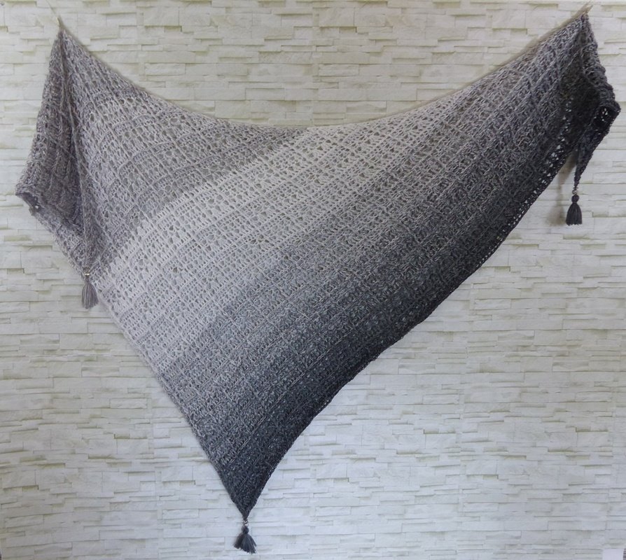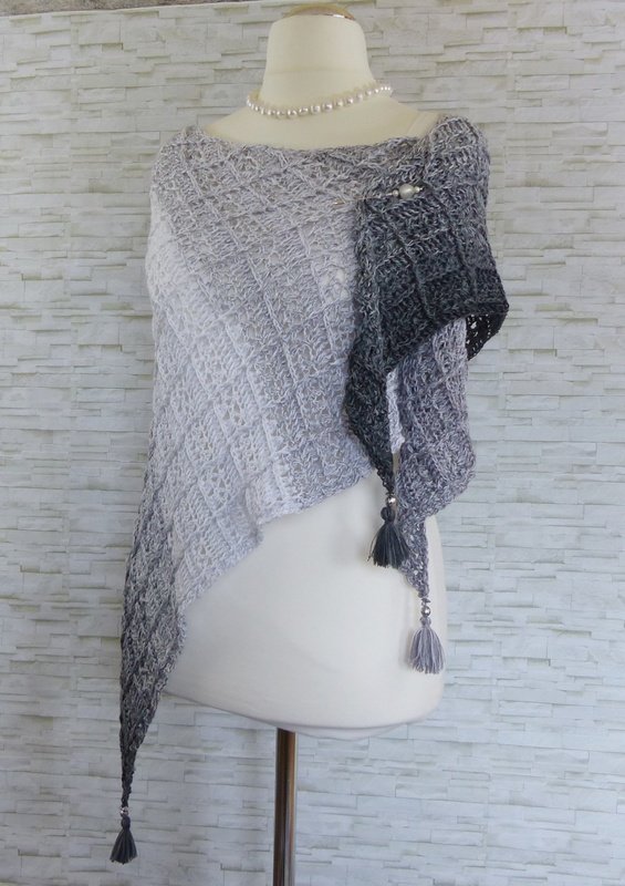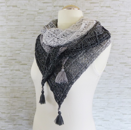 Das Dreieckstuch wird von der Seite her gehäkelt und ist leicht asymmetrisch. Die Größe kann selbst bestimmt werden, das sich der Mustersatz alle 4 Reihen wiederholt. Die angebrachten Quasten peppen das Tuch auf.