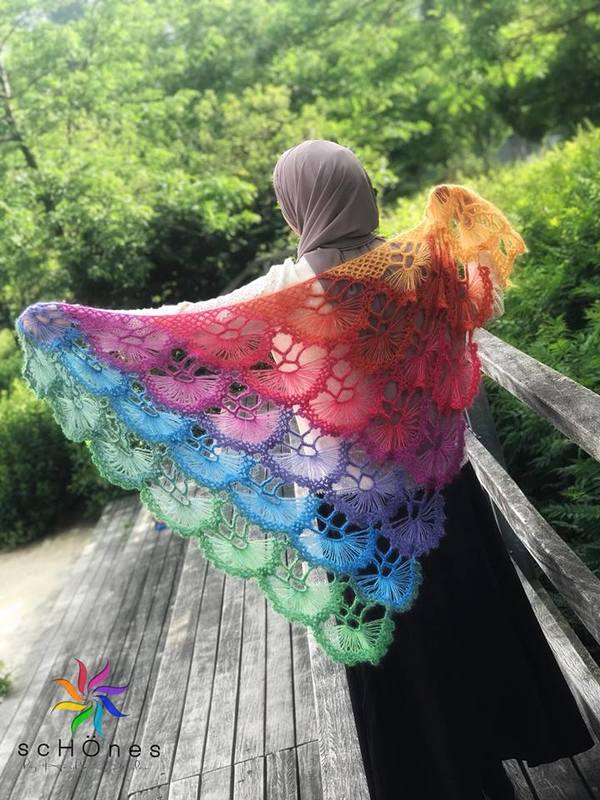 Der Clou an diesem Tuch ist die Häkeltechnik, es wird NICHT, wie man annehmen möchte, Flosse für Flosse gehäkelt (Fächer für Fächer), sondern man muss "um die Ecke" denken. Daher ist dieses Tuch insbesondere auch für Fortgeschrittene eine abwechslungsreiche Häkelerfahrung.