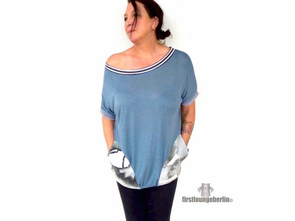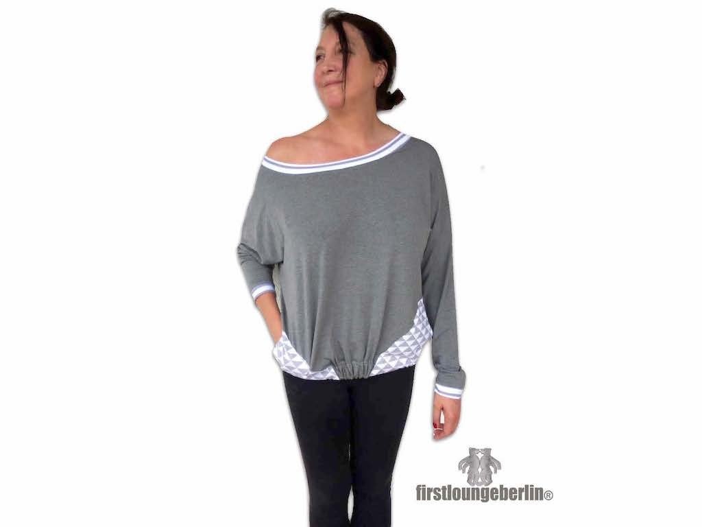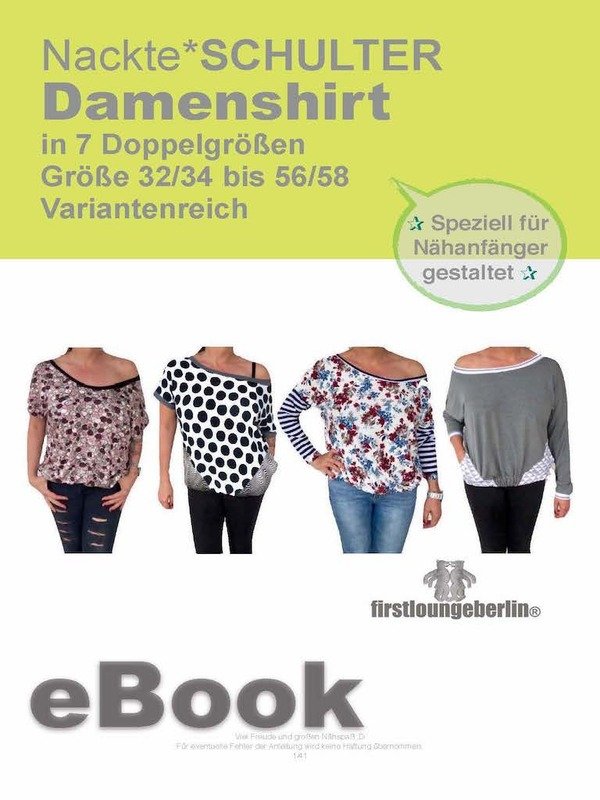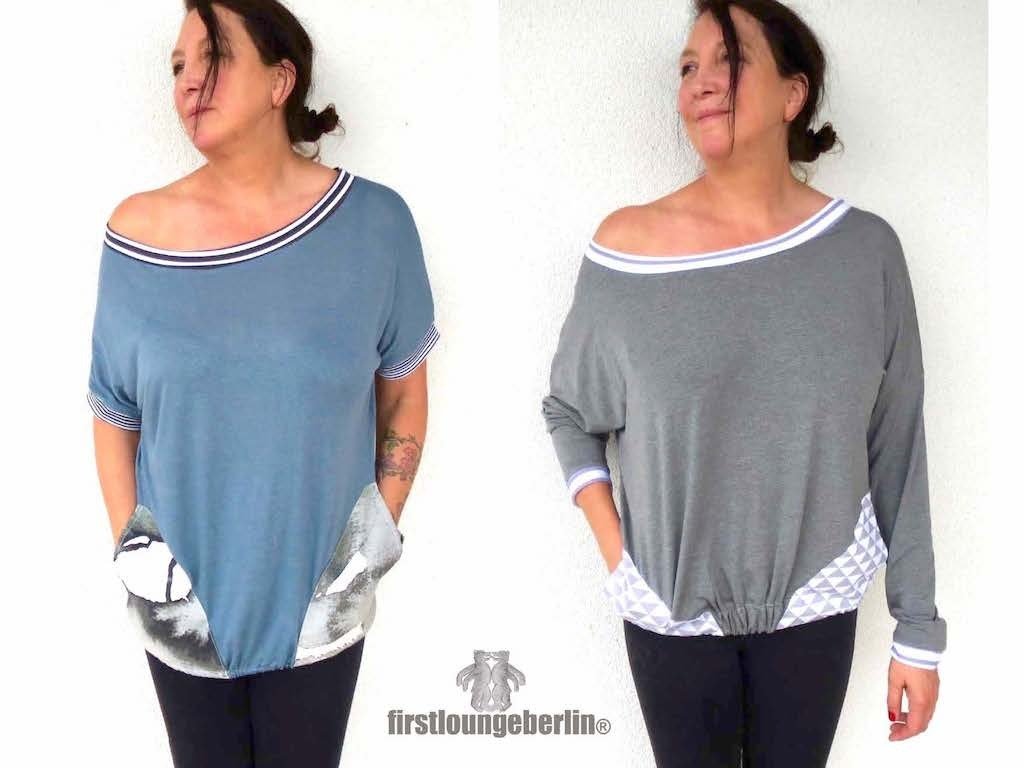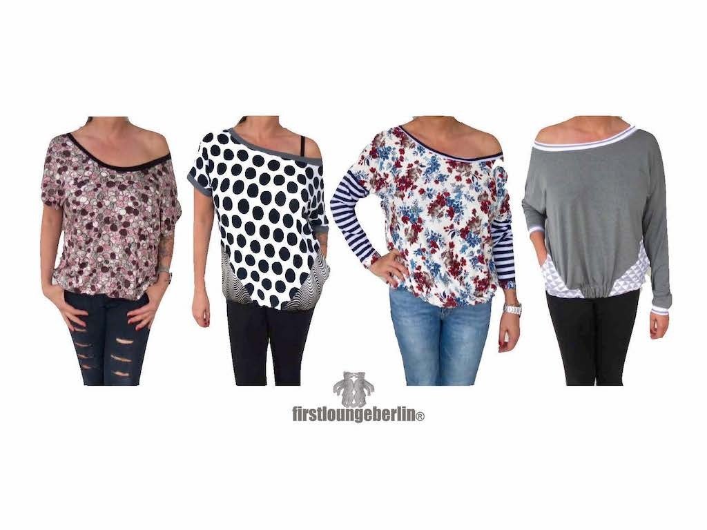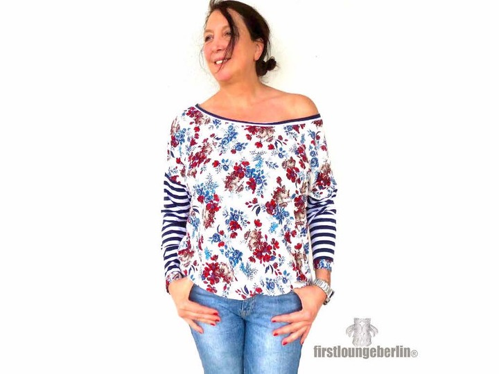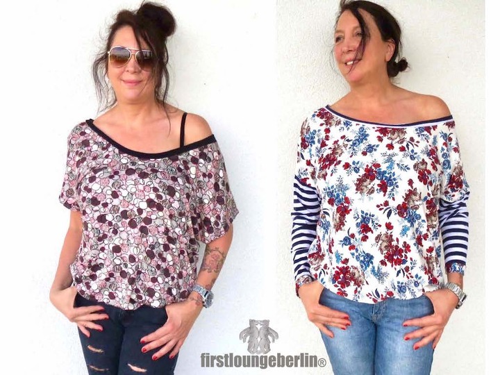 Nackte Schulter Damenshirt lässig und superbequem - in 7 Doppelgrößen von Größe 32/34 bis 56/58 - mit mehreren Nähvarianten und ausführlicher Nähanleitung mit Schnittmuster.