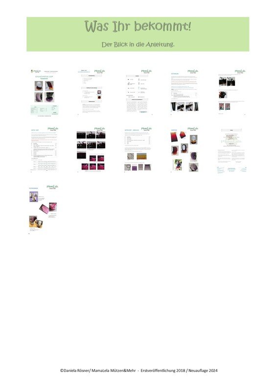 © Alle Rechte dieser Anleitung liegen bei Daniela Rösner – MamaLela Mützen&Mehr. Meine Anleitungen dürfen nur für den privaten Zweck genutzt werden. Verkauf, Vervielfältigung, Tausch und Veröffentlichung (inkl. Übersetzungen) der Anleitung (einschließlich Veröffentlichung im Internet) ist untersagt. Der Verkauf der fertigen Produkte, sowie jede andere Form der gewerblichen Nutzung, ist nur nach persönlicher Rücksprache und der schriftlichen Zusage des Urhebers gestattet. Das Verschenken und der lokale Verkauf der fertigen Produkte auf z.B. Märkten sind bis zu einer Menge von 10 Stück erlaubt, sofern die Produkte von Ihnen selbst gefertigt wurden. Das Design der Produkte ist geistiges Eigentum von Daniela Rösner. In jedem Fall ist beim Zeigen der gehäkelten Produkte im Netz und Lokal ein Hinweis auf das Design von ©MamaLela Mützen&Mehr erforderlich.