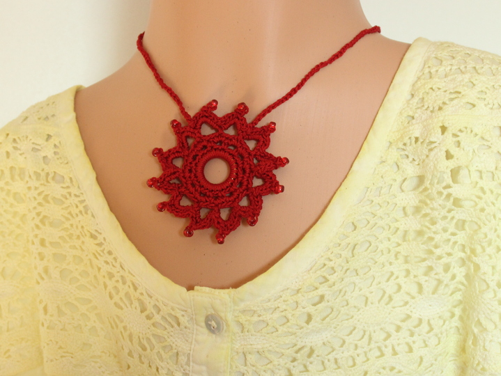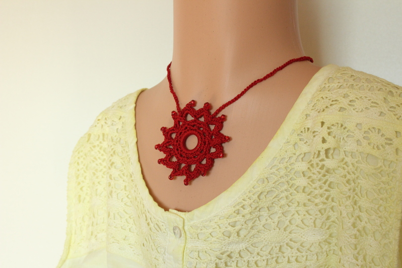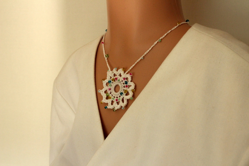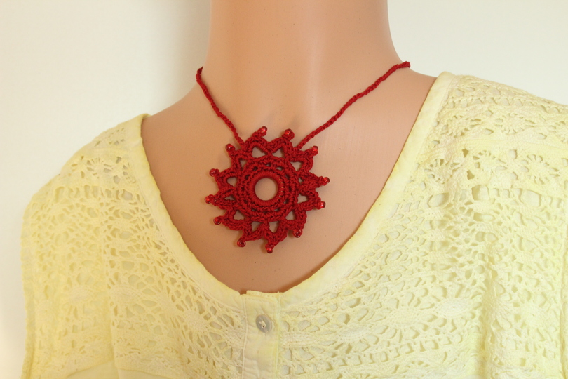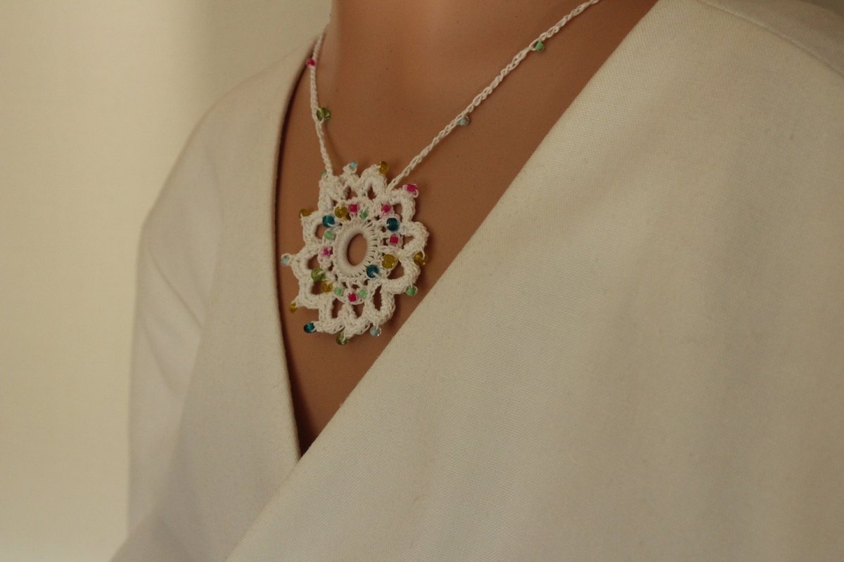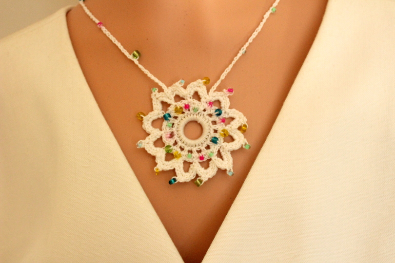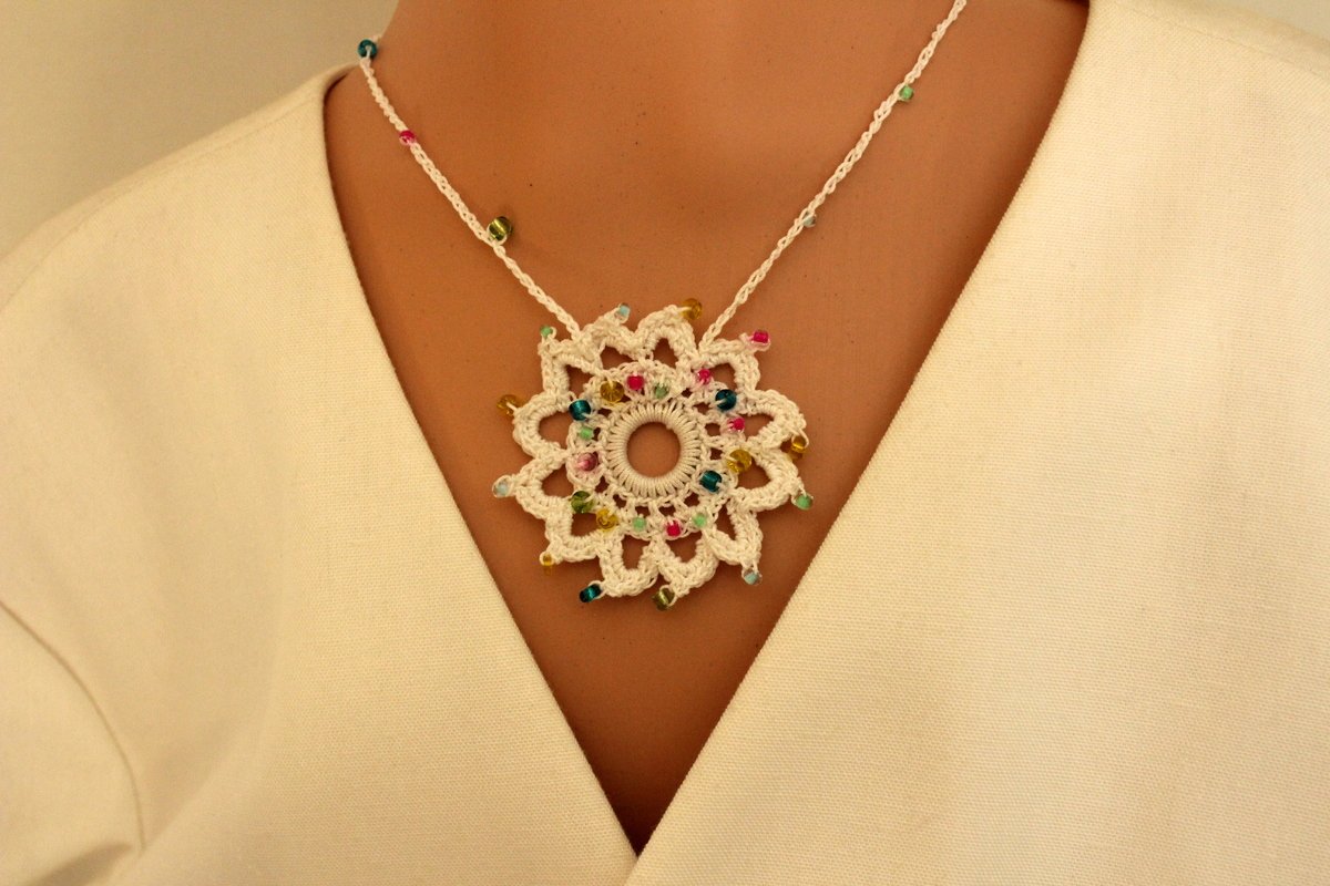 Die Häkelkette „Mandala“ kann kurz oder lang getragen werden. Sie wird aus Baumwollgarn in euren Wunschfarben gehäkelt. Ihr könnt Perlen an verschiedenen Stellen einfügen. Die Anleitung beschreibt beide in den Produktfotos abgebildeten Varianten.