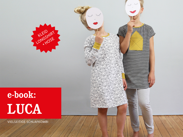 Mit dieser Schlafkombi bleiben keine Wünsche offen. Variiere die Länge des leicht ausgestellten Kleides und kombiniere es wahlweise mit der schmalen Hose. Ob lange oder kurze Ärmel, mit LUCA ist alles möglich. Und das schönste ist: Diese Schlafkombi ist so schnell genäht, dass noch genug Zeit bleibt, Deine nächste Übernachtungsparty zu planen!