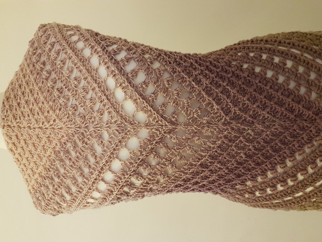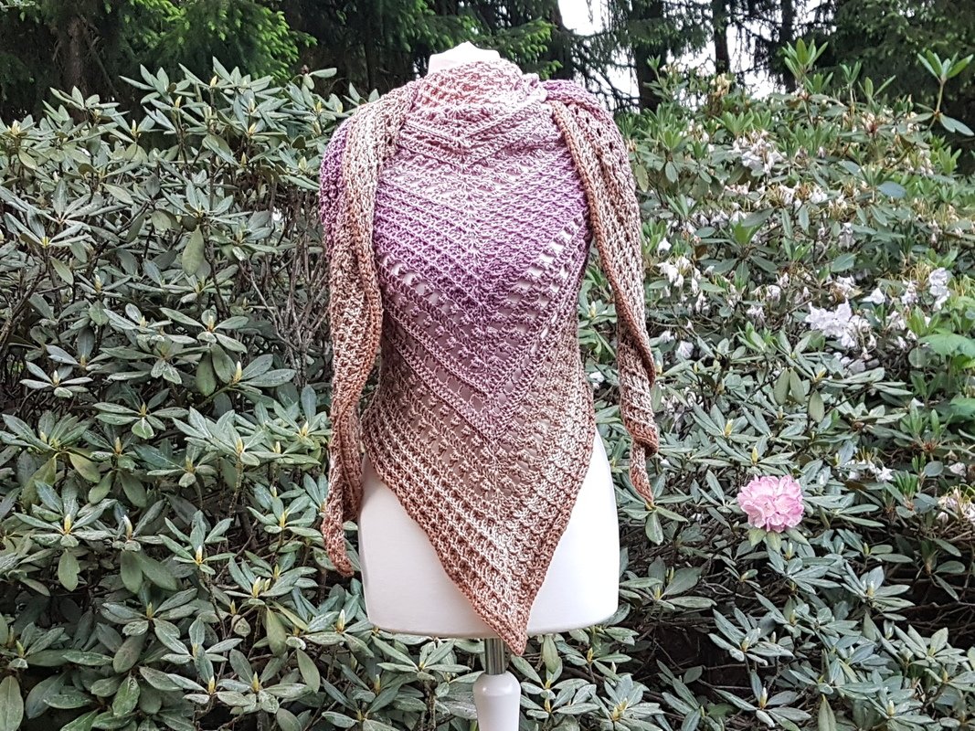 Ich habe für das Tuch etwa 1500 m 4-fach gefachtes Garn mit einer Nadelstärke 4,0 gehäkelt.