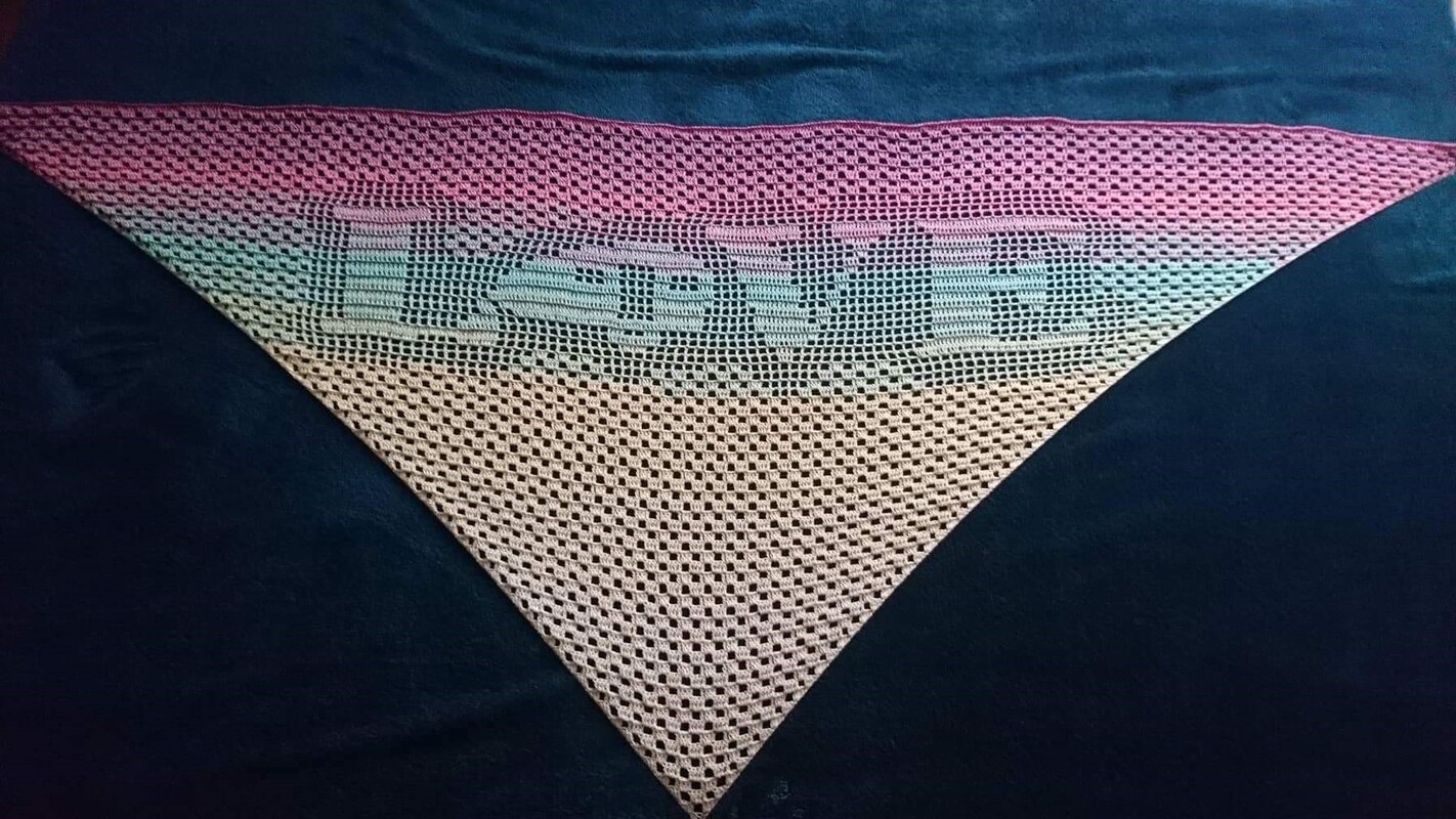 Die Anleitung ist auf 4 Seiten in teilweise Schrift (Erklärung Filethäkeln), der Anfang des Tuches in Häkelschrift und Zählraster geschrieben.