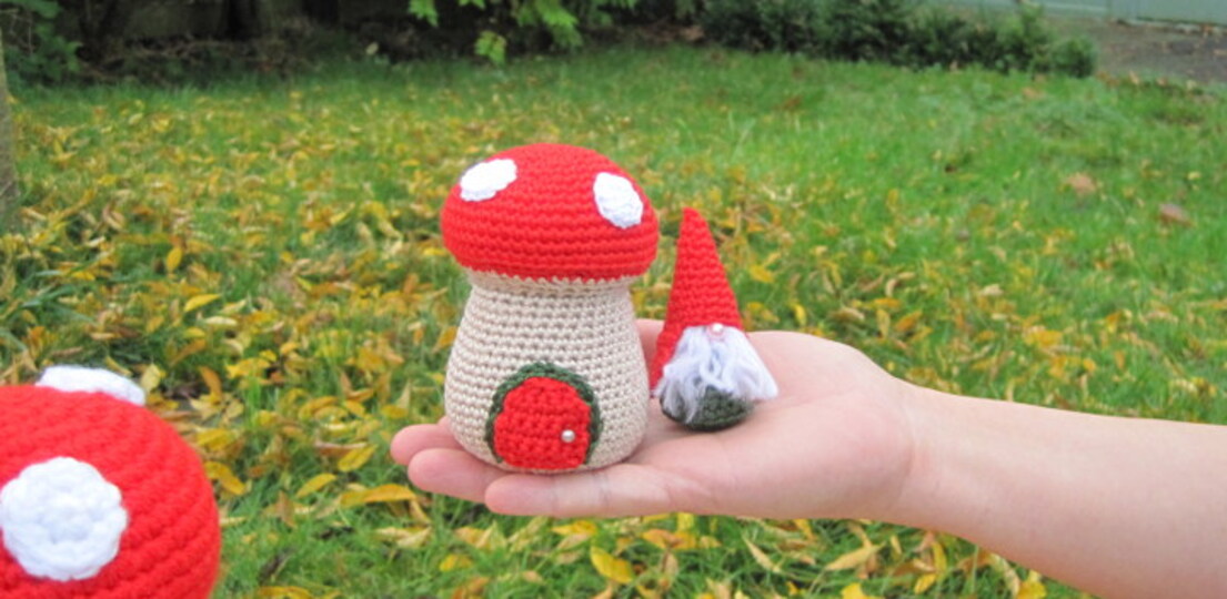 Die Zwerge und Pilzhäuser sind ganz einfach zu machen. Sie sind mit extradickem Garn und einer Häkelnadel Nr. 5,5 gemacht. Die Anleitung besteht aus dem Zwerg und dem Pilzhaus. Sowohl die Trolle als auch die Fliegenpilze können selbständig stehen.