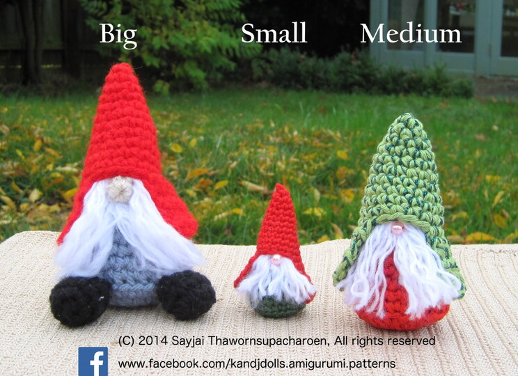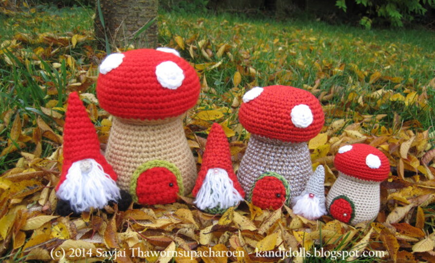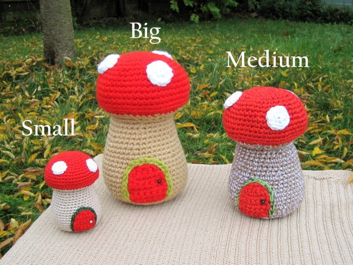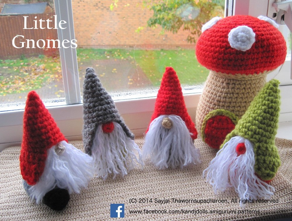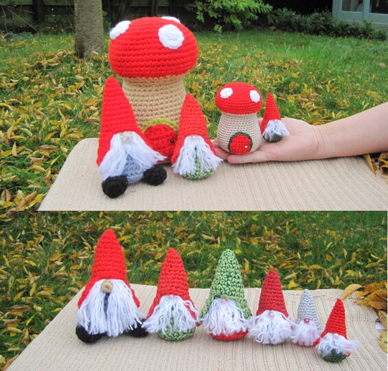 Sie können die Trolle und die Pilze größer oder kleiner machen, ohne dass das Muster angepasst werden muss. Der große Zwerg ist etwa 12,5 cm hoch, der große Pilz ungefähr 17,5. Die Größe der Puppen ist abhängig von der Größe der verwendeten Häkelnadel, der Dicke des Garns und davon, wie fest Sie sie ausstopfen; eine größere Häkelnadel und dickeres Garn haben größere Zwerge als Ergebnis. Ein fester ausgestopfter Zwerg ist größer als ein nur locker ausgestopfter.