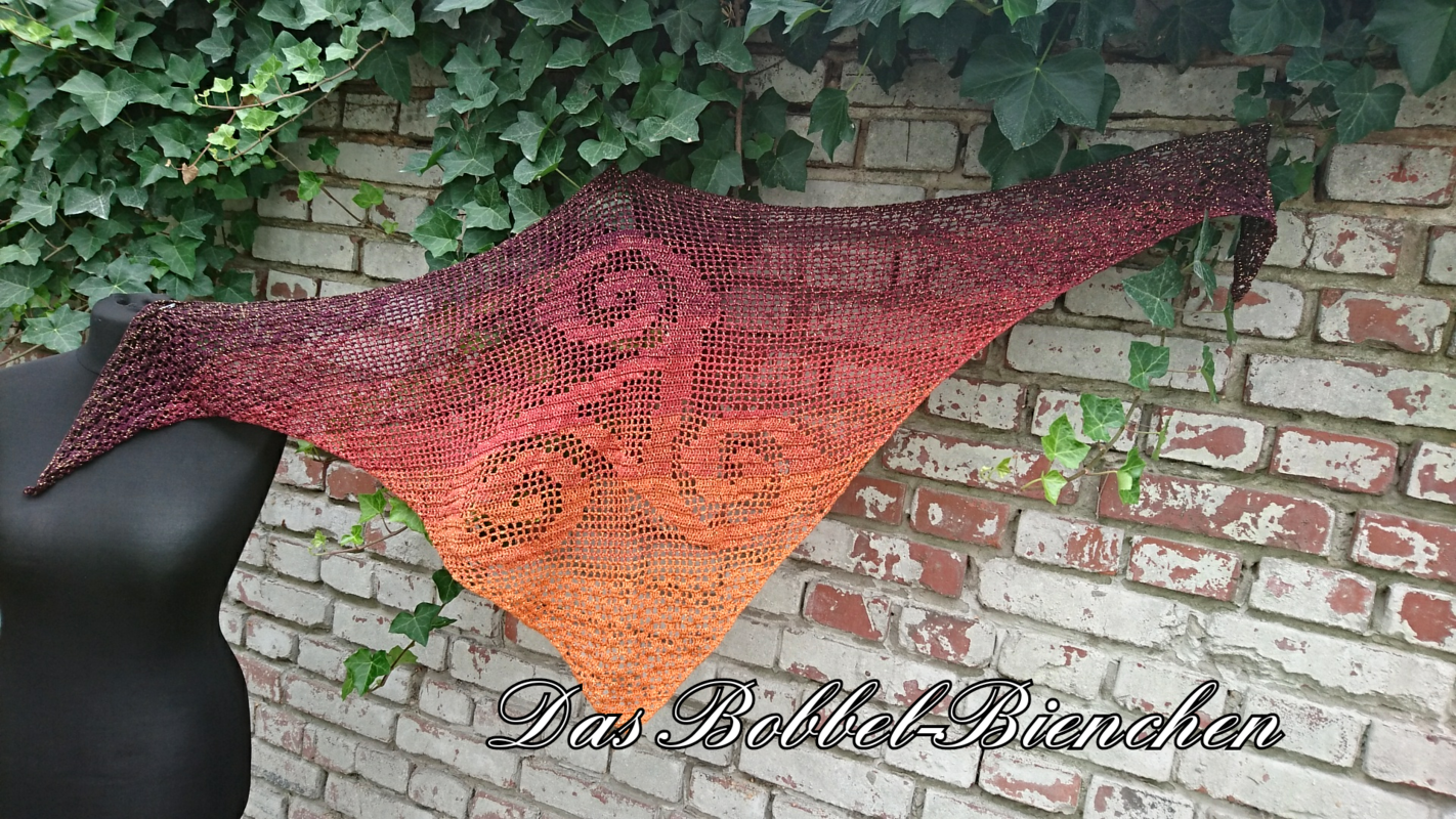 Es handelt sich um ein Motivtuch mit einem Keltischen Knoten die Triskele. Das Tuch hat am Ende ca. 1,70m Länge und eine Breite von ca. 73cm
