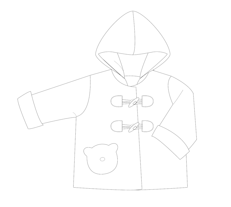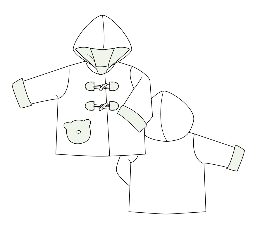 Besondere Details sind die Kapuze, dekorative Holzknöpfe, praktische Ärmelumschläge und eine süße Bär-Applikation.