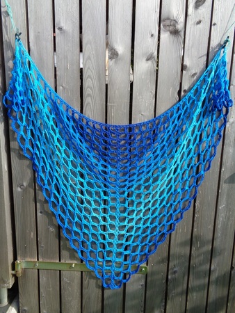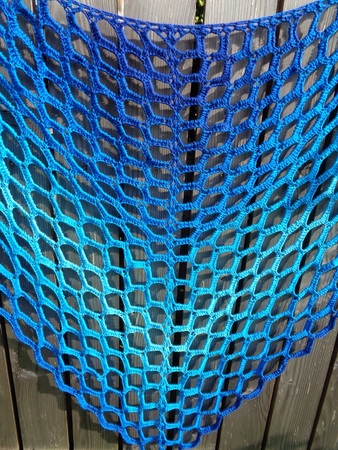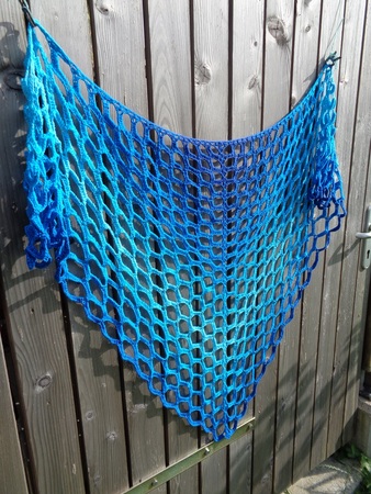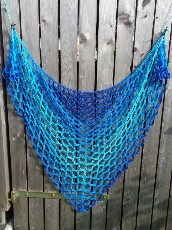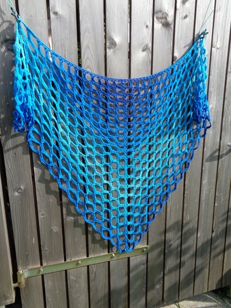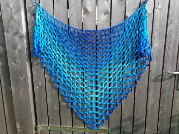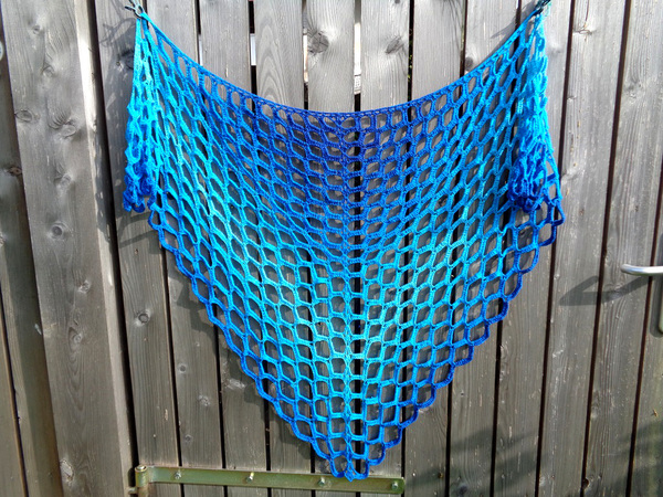 Zum Material des Originaltuchs:1 Farbverlaufsbobbel „Azzuro special“, 700 m, 4-fädig, Baumwolle/Seide von Maggie P., (Da diese Wicklung eine Spezialwicklung ist, frag Maggie um ähnliche Wicklungen! Suche dir deine Lieblingsfarben aus!)