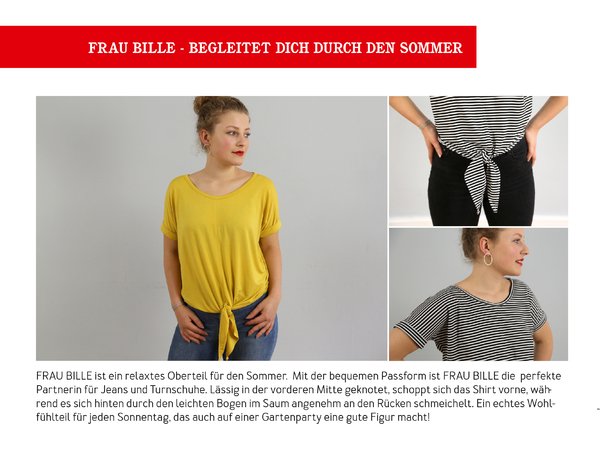 FRAU BILLE ist ein relaxtes Oberteil für den Sommer. Mit der bequemen Passform ist FRAU BILLE die perfekte Partnerin für Jeans und Turnschuhe. Lässig in der vorderen Mitte geknotet schoppt sich das Shirt vorne, während es sich hinten durch den leichten Bogen im Saum angenehm an den Rücken schmeichelt. Ein echtes Wohlfühlteil für jeden Sonnentag, dass auch auf einer Gartenparty eine gute Figur macht.