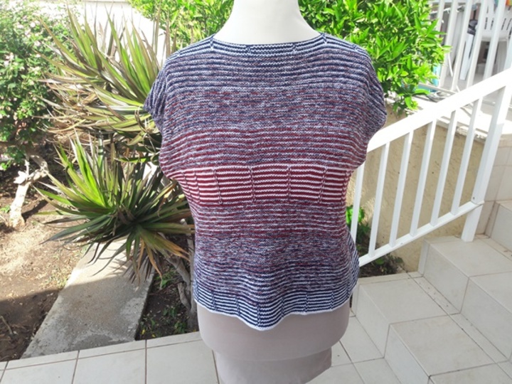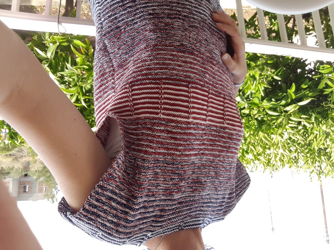 Kraus rechts gestrickte Partien werden unterbrochen von mit Hebemaschen gestrickten Partien.