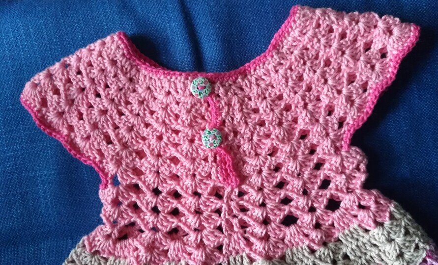 Dieses niedliche Häkelkleidchen ist schnell gehäkelt und man kann damit Garnreste aufbrauchen. Ich habe es in rosa, lila Tönen gearbeitet, sieht sich auch in blau süss aus. Das Kleidchen ist für Größe 62 - 68 gemacht. Auf der Rückseite hat es zwei kleine Schlaufen für Knöpfe. Auf der Vorderseite wurden 2 kleine Häkelblumen platziert.